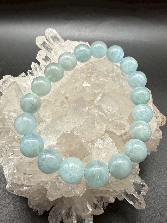 3月の誕生石「アクアマリン」のブレスレットです。 アクアマリンは、ラテン語の「aqua」=水「marinus」=海から、太古の昔から海の精が愛した宝石として、また、海の精が石になったものと言われ、船乗りたちのお守りとして大切にされていました。 また、「勇気の石」とも言われ、本来の自分以上の力や潜在的に眠る能力を引き出し、未来へと進む力をサポートいたします。 船乗りのお守りとなっていたのは、大漁や航海の安全を意味するだけではなく、地球の叡智を秘めたこの石を持つことで、海の嵐をも穏やかにする力を与え、大いなる海に自らの心を見失うことなく生きる強さと輝きを与え、希望を実現へと導く力が宿るとされていました。 この時代に生きる私たちにとっても、まさに人生とは、大海原で生きることと同じかもしれません。 自分らしさを見失わずに、いかに人生という旅を実り豊かに生きていくか。 そして、地球の叡智を受け取り、様々な出逢いと共に自分を成長させて行ける未来を歩む。 アクアマリンは、この時代に生きる私たちへ、きっと素晴らしい未来への気づきと勇気と共に幸福な人生をサポートすることでしょう。 *こんな方におすすめです ・幸福な人生に ・ストレスを軽減して心穏やかに過ごしたい ・自分の才能を輝かせたい ・精神的にポジティブになりたい ・不必要なものは何かを見出し、手放していきたい ・癒しとやすらぎのある毎日が欲しい ・幸福な人生・結婚・夫婦・親子・友情あらゆる人間関係を改善または向上させたい ・倦怠期の愛情を復活させたい ・愛のある人生を送りたい ・ヒーリングなどの仕事をされる方に ・細胞の活性化・喘息や呼吸器、肺の改善に ・水泳を頑張りたいかたに ・交渉事やプレゼン、コミュニケーションを円滑に成功させたい方に *お届けする際に、すべて浄化と身に付ける方との共鳴の光を込めさせていただいております。すぐにご使用いただけます。 *身に付ける際には、そっと、石へ心で願いを伝えてみてください。 ☆当店のパワーストーンは、すべて天然半貴石を使用しています。 粒により、インクルージョン(内包物)が見られる場合がございますが、これ は天然の鉱物の証であり、不良品ではございません。 自然の風合いをお楽しみください。 ☆画像はすべて実物を撮影したものです。 *ブレスレットサイズについて ・当店は「内径実寸」サイズを明記しています。 「内径実寸」とは、ブレスレットの石の内周を表します。 以下をご参考になさってサイズをお選びください。 ・初めての方は、「手首実寸」をメジャーや紐などできつくない程度の「ぴったり」なサイズを測って下さい。 ・【手首実寸 +0.5㎝】…「ぴったりめ」 ・【手首実寸 +0.5㎝~1.5㎝】...「標準」(指が一本分手首に入るゆとりです) ・【手首実寸 +1.5㎝~3㎝】...「ゆったりめ」 アクアマリン⑦ 内径実寸 約18cm(手首実寸 約16~17.5cmの方向け) アクアマリン 約11.6㎜×18 約39g