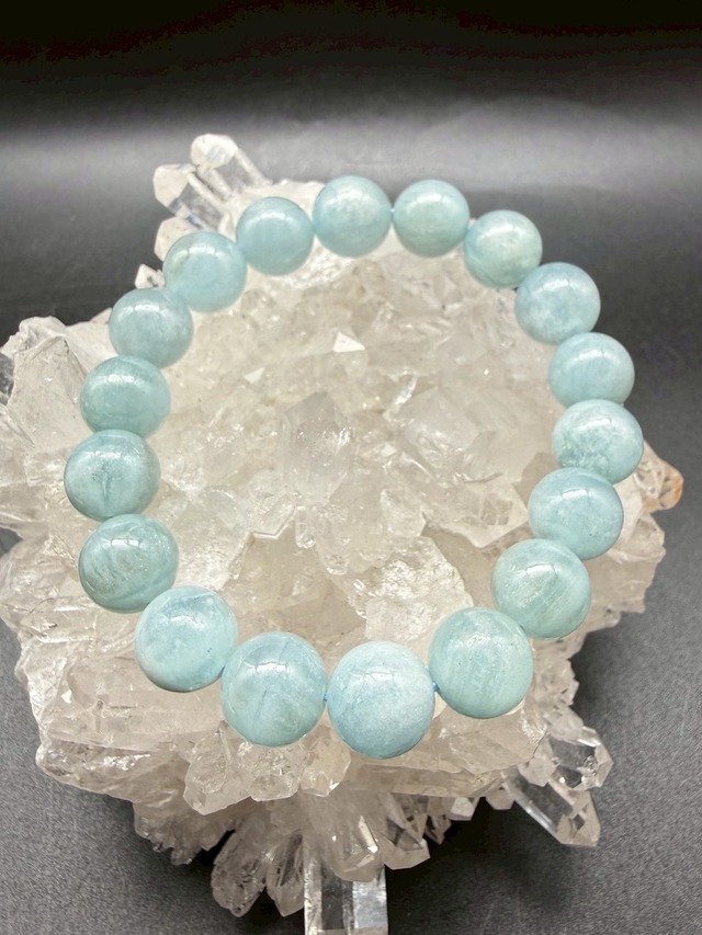 3月の誕生石「アクアマリン」のブレスレットです。 アクアマリンは、ラテン語の「aqua」=水「marinus」=海から、太古の昔から海の精が愛した宝石として、また、海の精が石になったものと言われ、船乗りたちのお守りとして大切にされていました。 また、「勇気の石」とも言われ、本来の自分以上の力や潜在的に眠る能力を引き出し、未来へと進む力をサポートいたします。 船乗りのお守りとなっていたのは、大漁や航海の安全を意味するだけではなく、地球の叡智を秘めたこの石を持つことで、海の嵐をも穏やかにする力を与え、大いなる海に自らの心を見失うことなく生きる強さと輝きを与え、希望を実現へと導く力が宿るとされていました。 この時代に生きる私たちにとっても、まさに人生とは、大海原で生きることと同じかもしれません。 自分らしさを見失わずに、いかに人生という旅を実り豊かに生きていくか。 そして、地球の叡智を受け取り、様々な出逢いと共に自分を成長させて行ける未来を歩む。 アクアマリンは、この時代に生きる私たちへ、きっと素晴らしい未来への気づきと勇気と共に幸福な人生をサポートすることでしょう。 *こんな方におすすめです ・幸福な人生に ・ストレスを軽減して心穏やかに過ごしたい ・自分の才能を輝かせたい ・精神的にポジティブになりたい ・不必要なものは何かを見出し、手放していきたい ・癒しとやすらぎのある毎日が欲しい ・幸福な人生・結婚・夫婦・親子・友情あらゆる人間関係を改善または向上させたい ・倦怠期の愛情を復活させたい ・愛のある人生を送りたい ・ヒーリングなどの仕事をされる方に ・細胞の活性化・喘息や呼吸器、肺の改善に ・水泳を頑張りたいかたに ・交渉事やプレゼン、コミュニケーションを円滑に成功させたい方に *お届けする際に、すべて浄化と身に付ける方との共鳴の光を込めさせていただいております。すぐにご使用いただけます。 *身に付ける際には、そっと、石へ心で願いを伝えてみてください。 ☆当店のパワーストーンは、すべて天然半貴石を使用しています。 粒により、インクルージョン(内包物)が見られる場合がございますが、これ は天然の鉱物の証であり、不良品ではございません。 自然の風合いをお楽しみください。 ☆画像はすべて実物を撮影したものです。 *ブレスレットサイズについて ・当店は「内径実寸」サイズを明記しています。 「内径実寸」とは、ブレスレットの石の内周を表します。 以下をご参考になさってサイズをお選びください。 ・初めての方は、「手首実寸」をメジャーや紐などできつくない程度の「ぴったり」なサイズを測って下さい。 ・【手首実寸 +0.5㎝】…「ぴったりめ」 ・【手首実寸 +0.5㎝~1.5㎝】...「標準」(指が一本分手首に入るゆとりです) ・【手首実寸 +1.5㎝~3㎝】...「ゆったりめ」 アクアマリン⑦ 内径実寸 約18cm(手首実寸 約16~17.5cmの方向け) アクアマリン 約11.6㎜×18 約39g