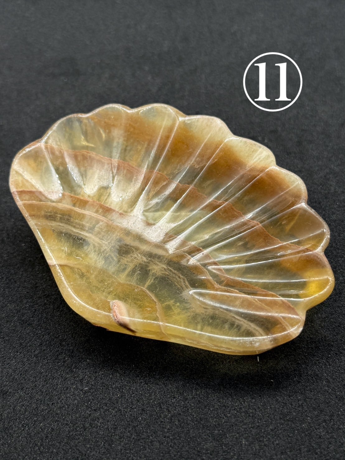 虹色の多彩な色を持つフローライトの中でも、ちょっと珍しいイエローカラーのシェル型トレイです。