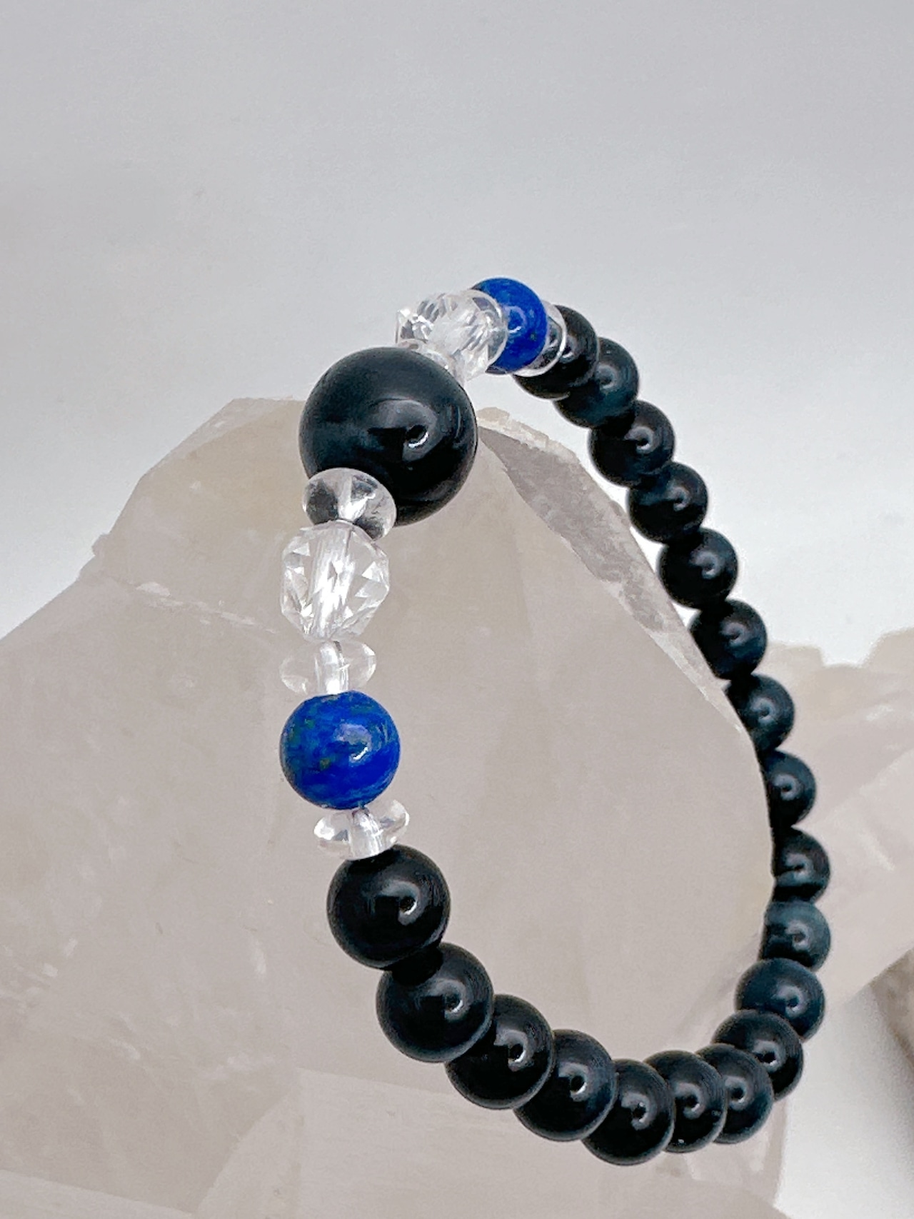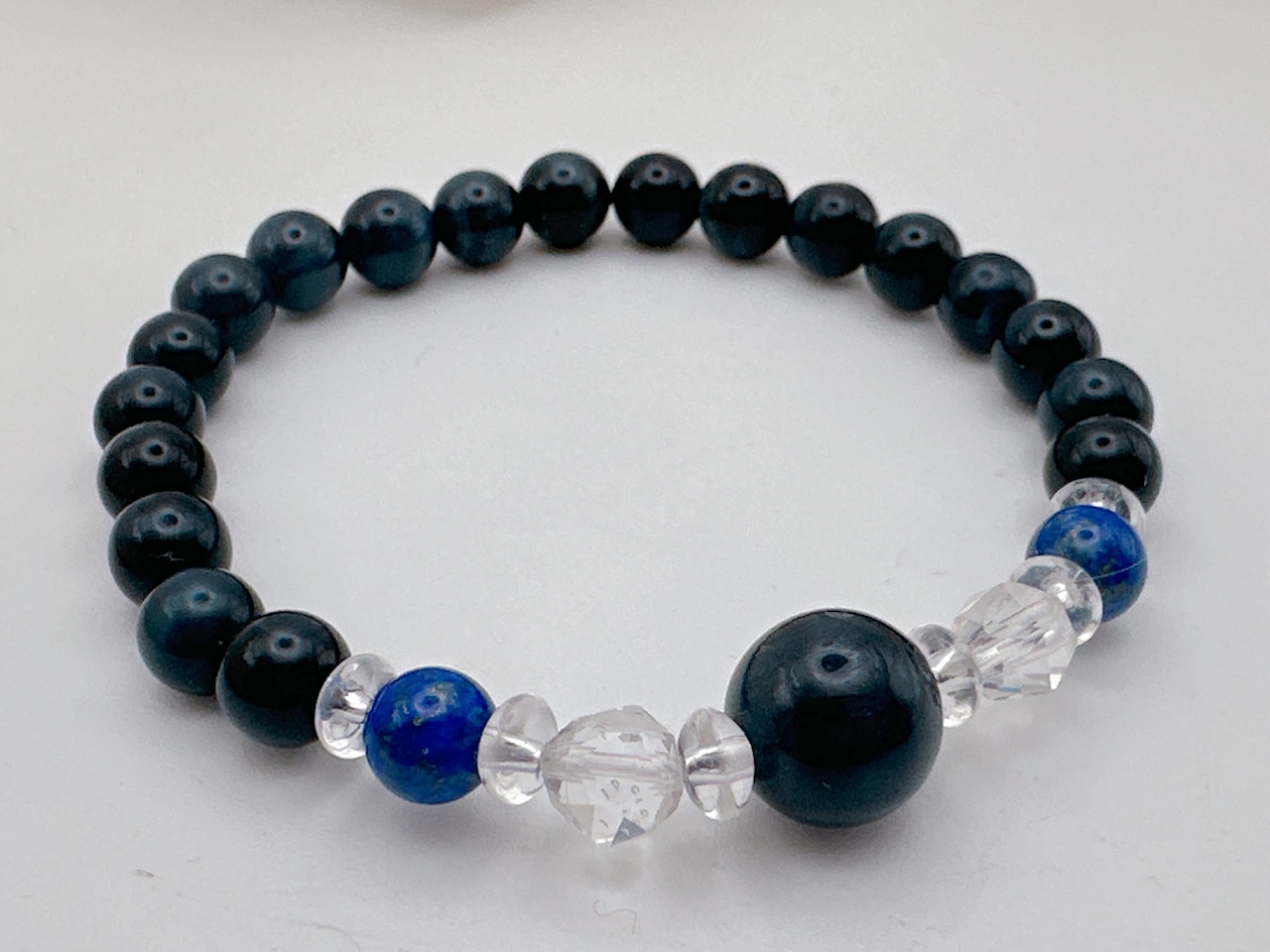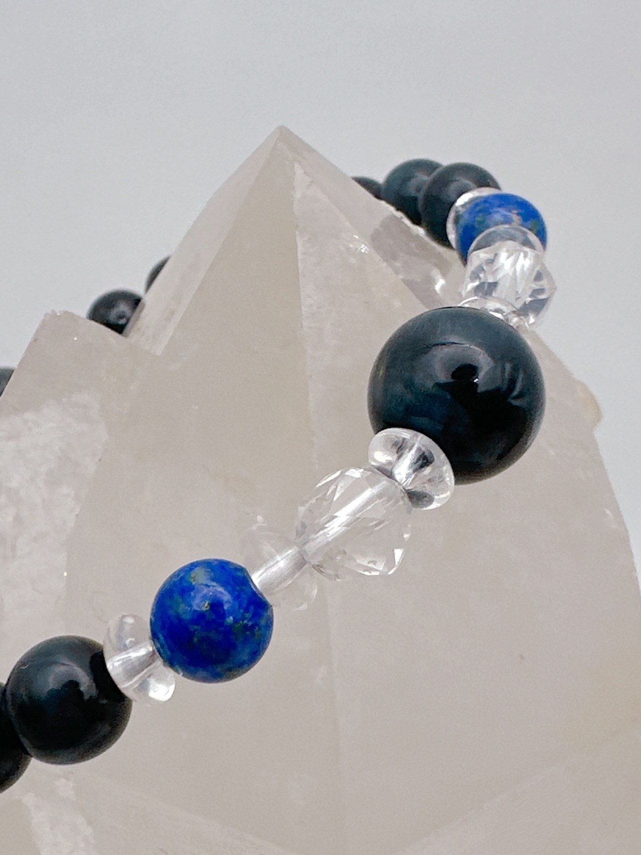 また、ブルータイガーアイとともにひとつの環となったラピスラズリと水晶それぞれにもパワーがあります。