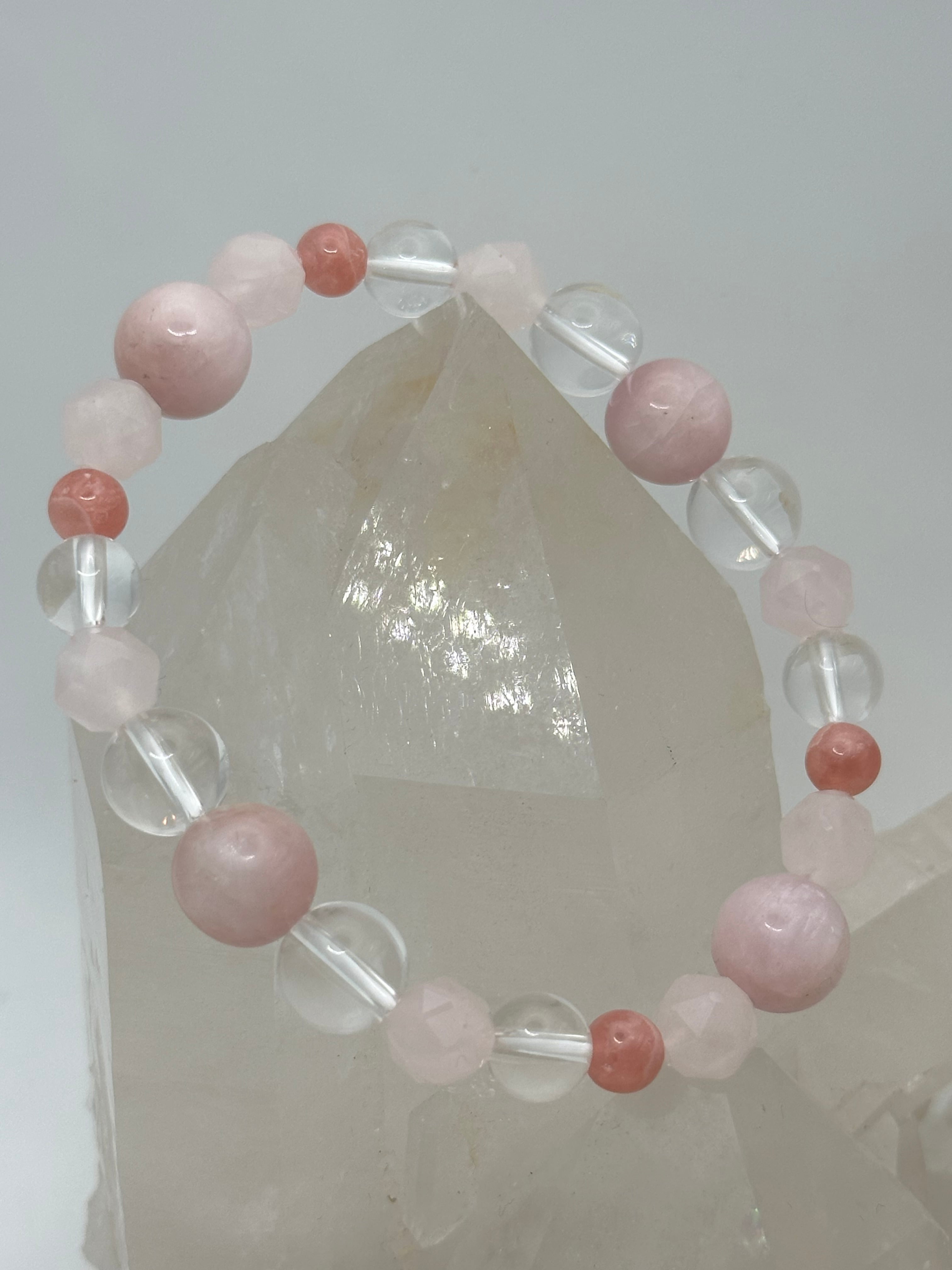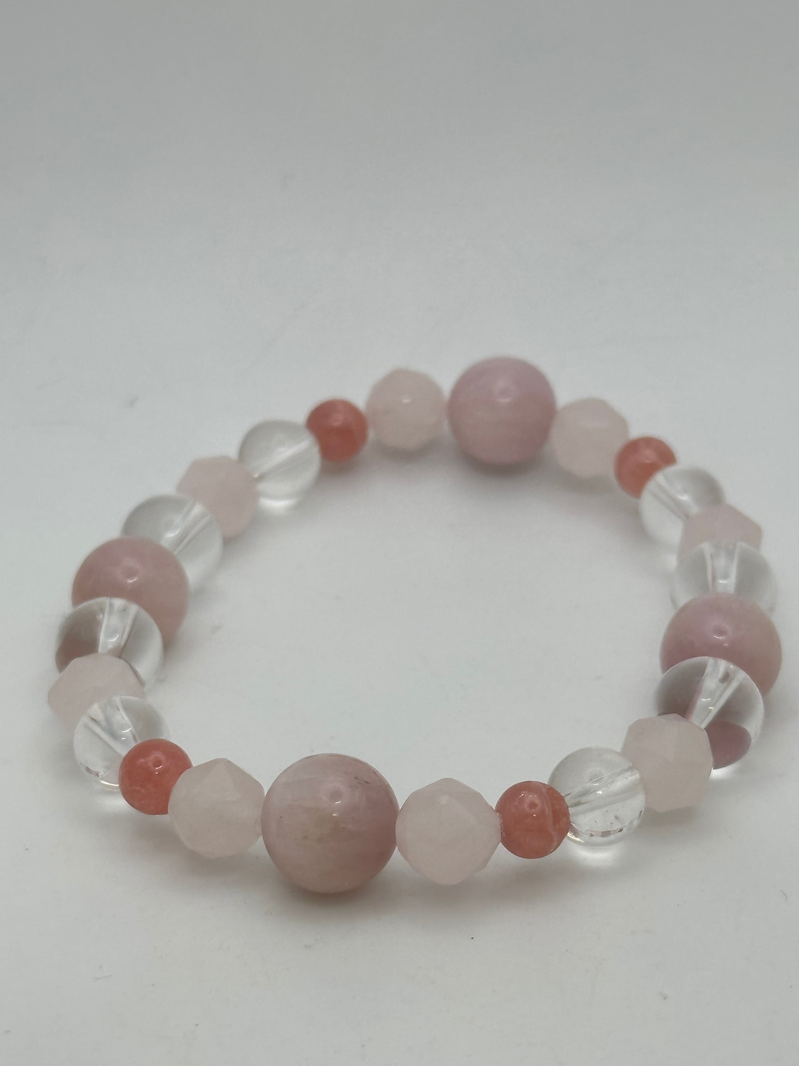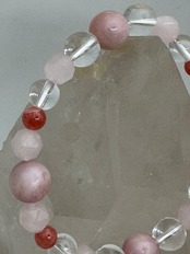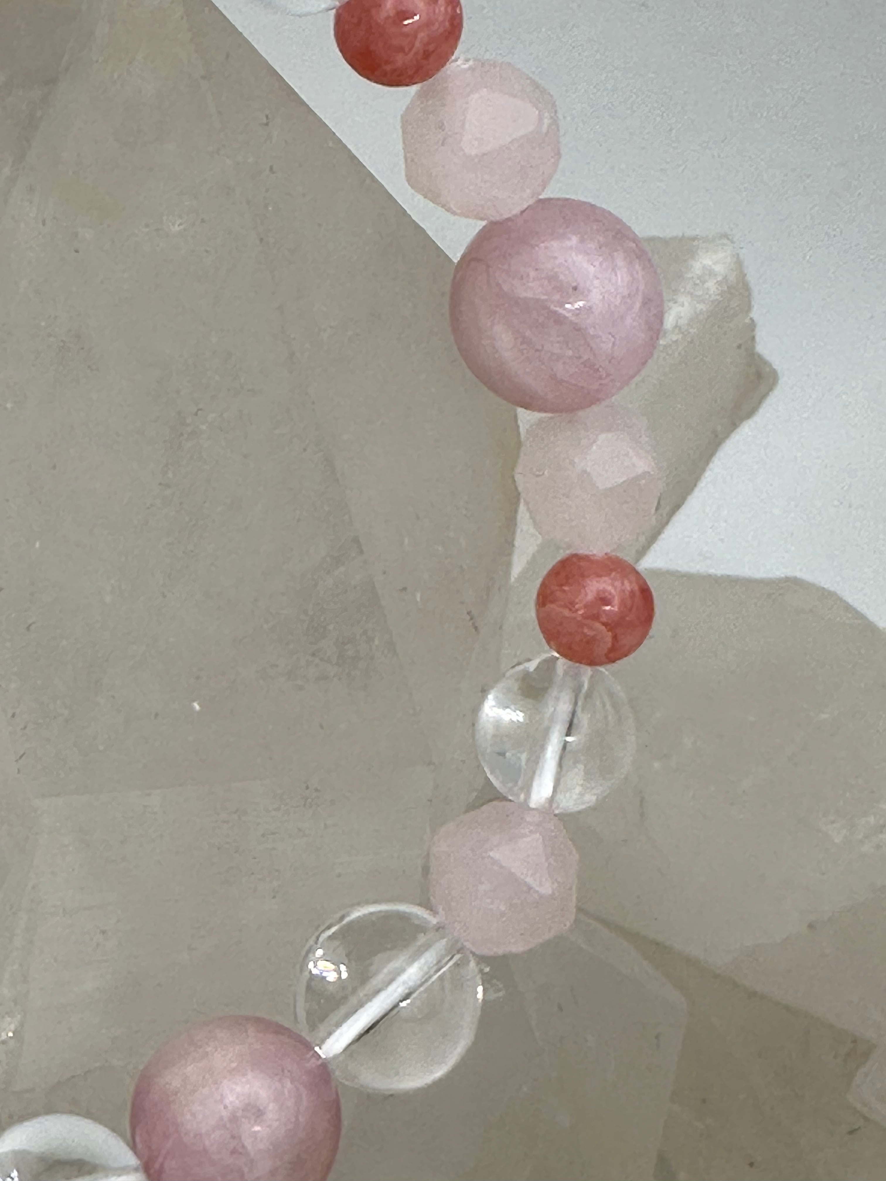 また、ローズクォーツとインカローズ(ロードクロサイト)を組み、心身の不安や緊張から身を守り、朗らかに自分らしく生きることを導き、自分に宿す魅力や才能の開花、美肌の導きを与えます。
