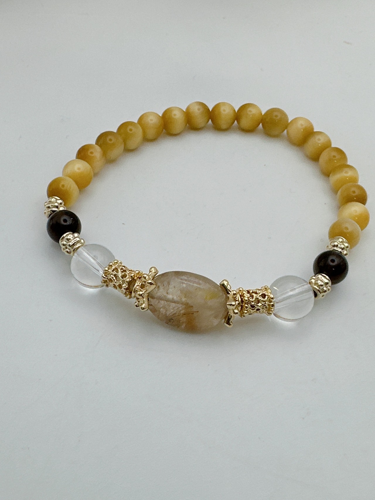 さらに、ゴールデンタイガーアイは、広く知られるタイガーアイよりも明るくキャッツアイのような煌めきが見られます。これは、タイガーアイの色合いを現代の技術で脱色加工して生まれた色です。ナチュラルなタイガーアイのパワーに加工されると、鉱物自体のパワーが減退するように思う方も多いですが、これは地球すべてと共に存在するこの現代だからこそ生まれたと言っても過言ではないのです。