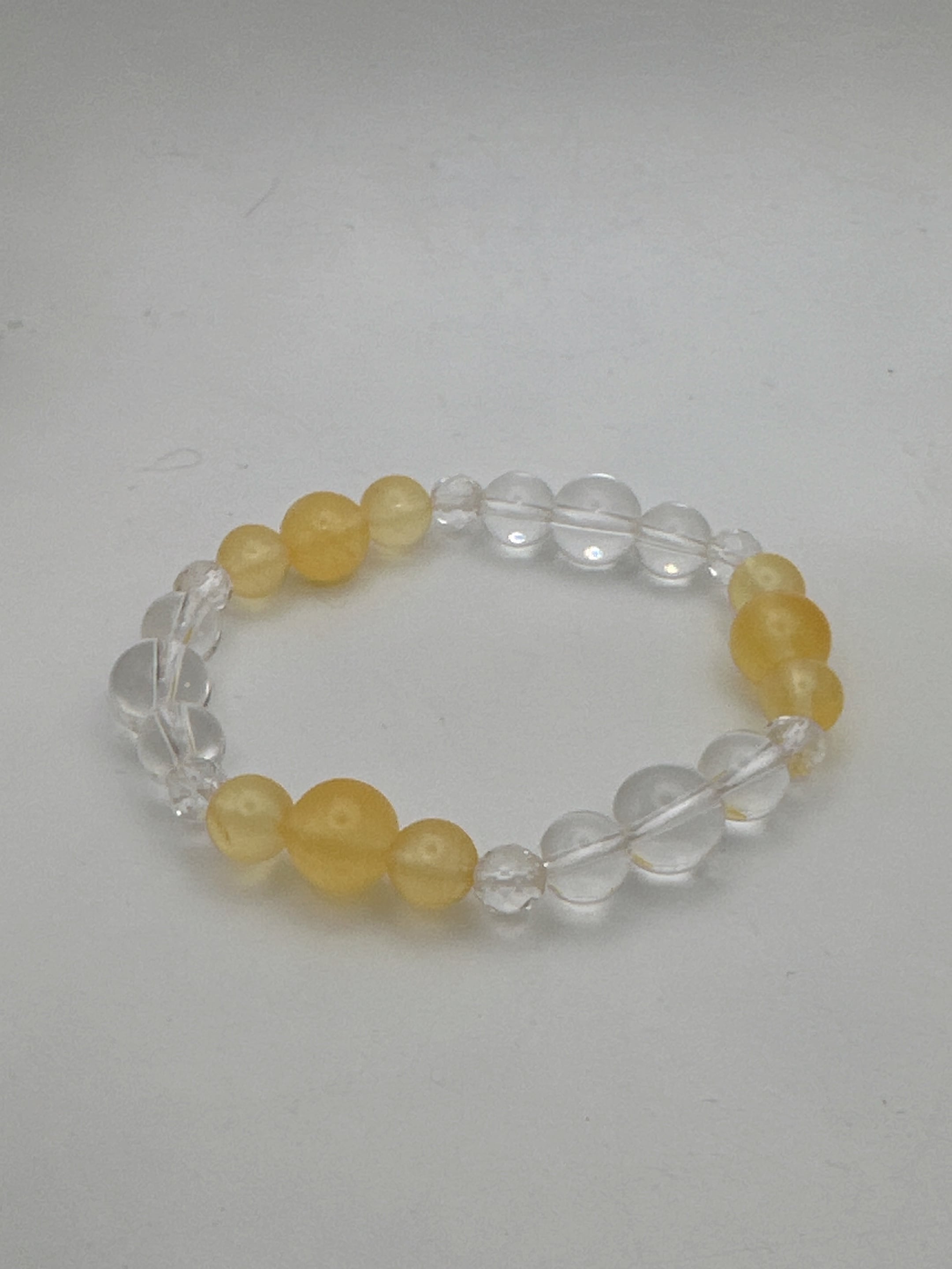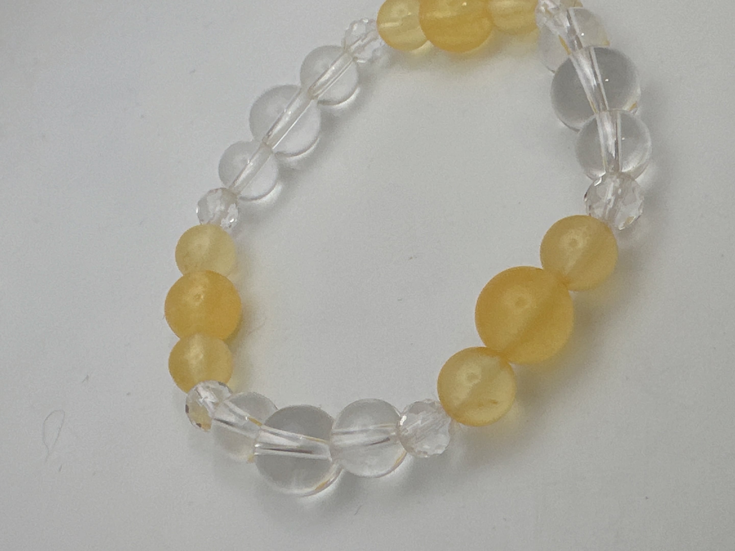 こちらのブレスレットは、水晶とイエローカルサイトが重なる事で、六芒星の印が生まれ、光放つ環となりました。
