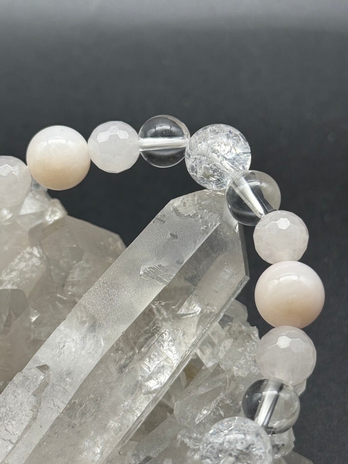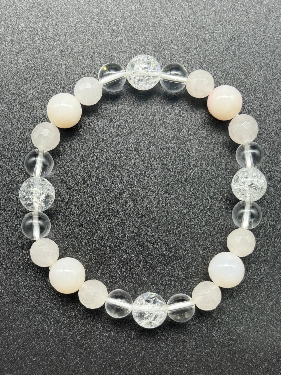 10月の誕生石のひとつ「ピンクオパール」、身に付けていくうちに共鳴の輝きで身を守り願望成就へと導きながらクラックが見える変化を表す「クラック水晶」とともに、優しいピンク色のローズクォーツ未来への希望を実現へと導く環に仕上げました。