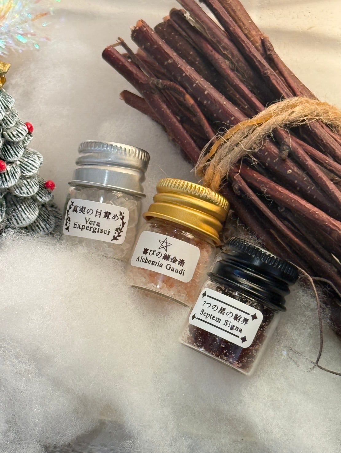 今回は、3つのオイルをお試しに楽しんでいただくため、3つの魔法の小瓶にそれぞれのパワーを宿した「Sal Terrae Lux Mundi (現世の光塩)」です!