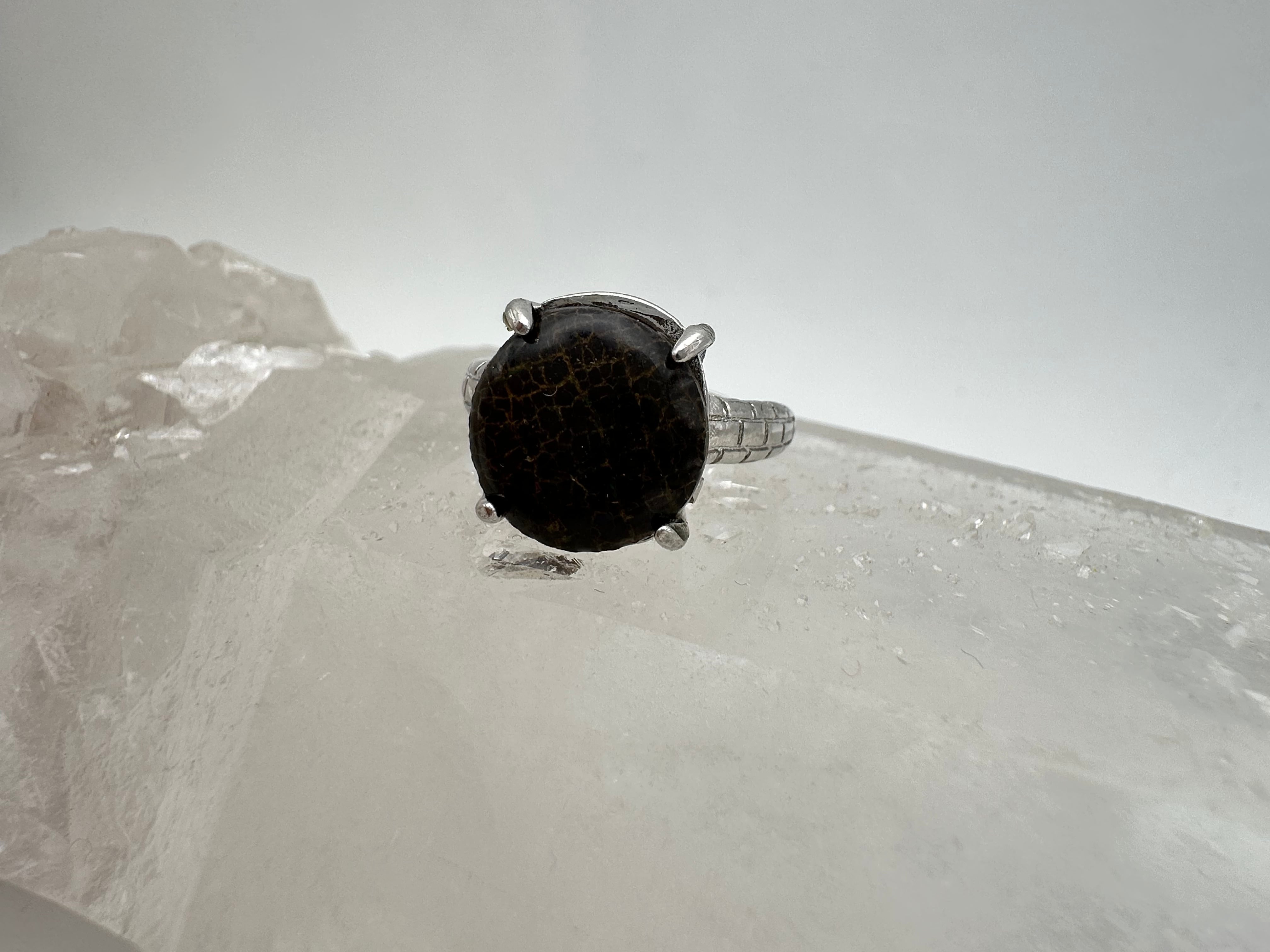 古代に生きたアンモナイトの化石になる過程で生まれた、美しい煌めきを放つ一部が指輪になった一品です!