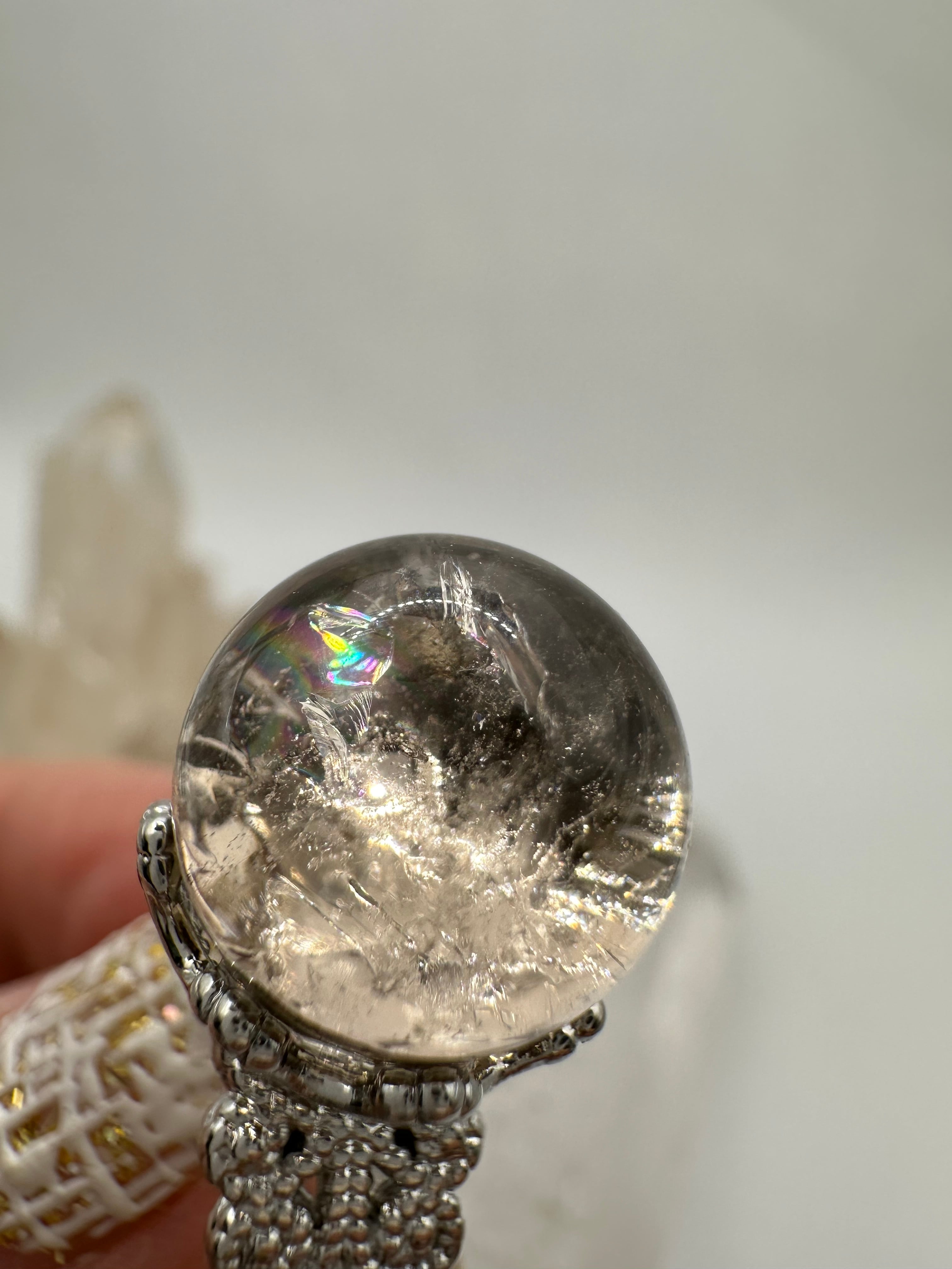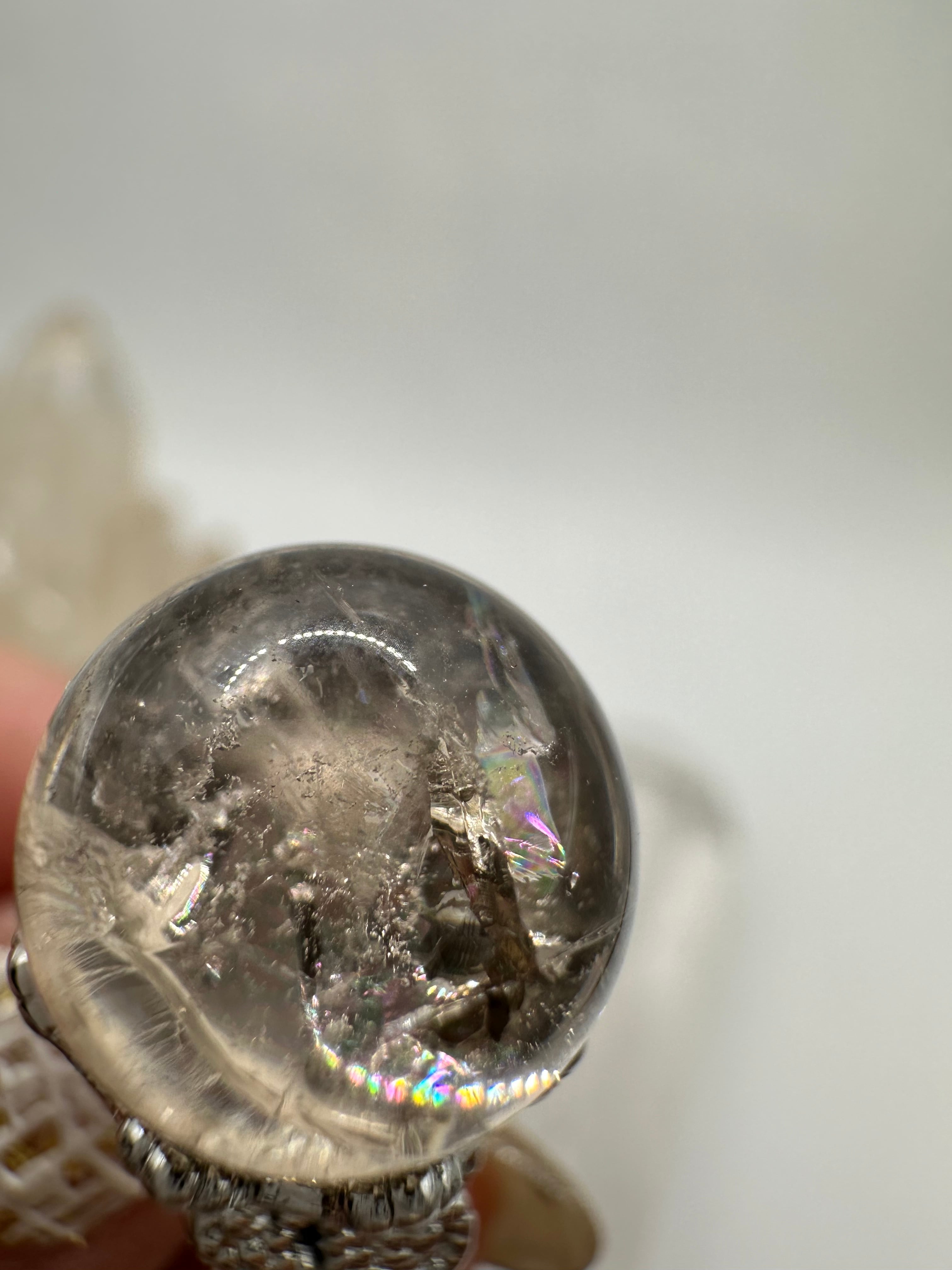 こちらの商品は、スモーキークォーツの中に生まれたクラック(ひび)に七色の虹色が見られます。
