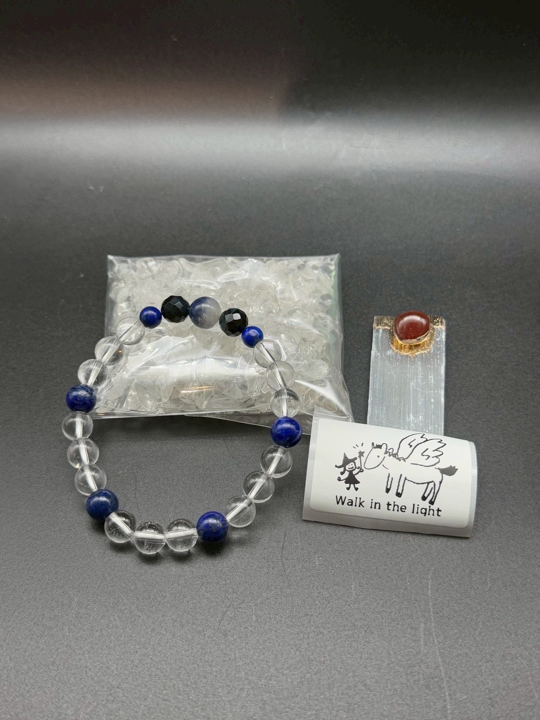 1点限りのKrehaオリジナルブレスレットと水晶サザレ、そしてセレナイトとパワーストーンのついた、気の浄化や癒しにおすすめなペンダントトップ(壁にかけて空間浄化にもおすすめです!)の大変お得なセットです!