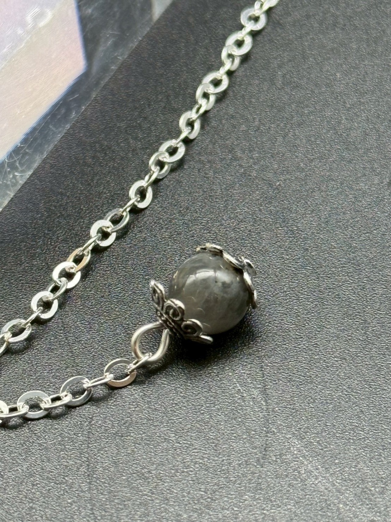 2.振り子の部分のパワーストーンから大体、手のひらから指先までの長さをゆとりを持たせてチェーンの先を「利き手」の親指、人差し指や中指で優しくつまみます。