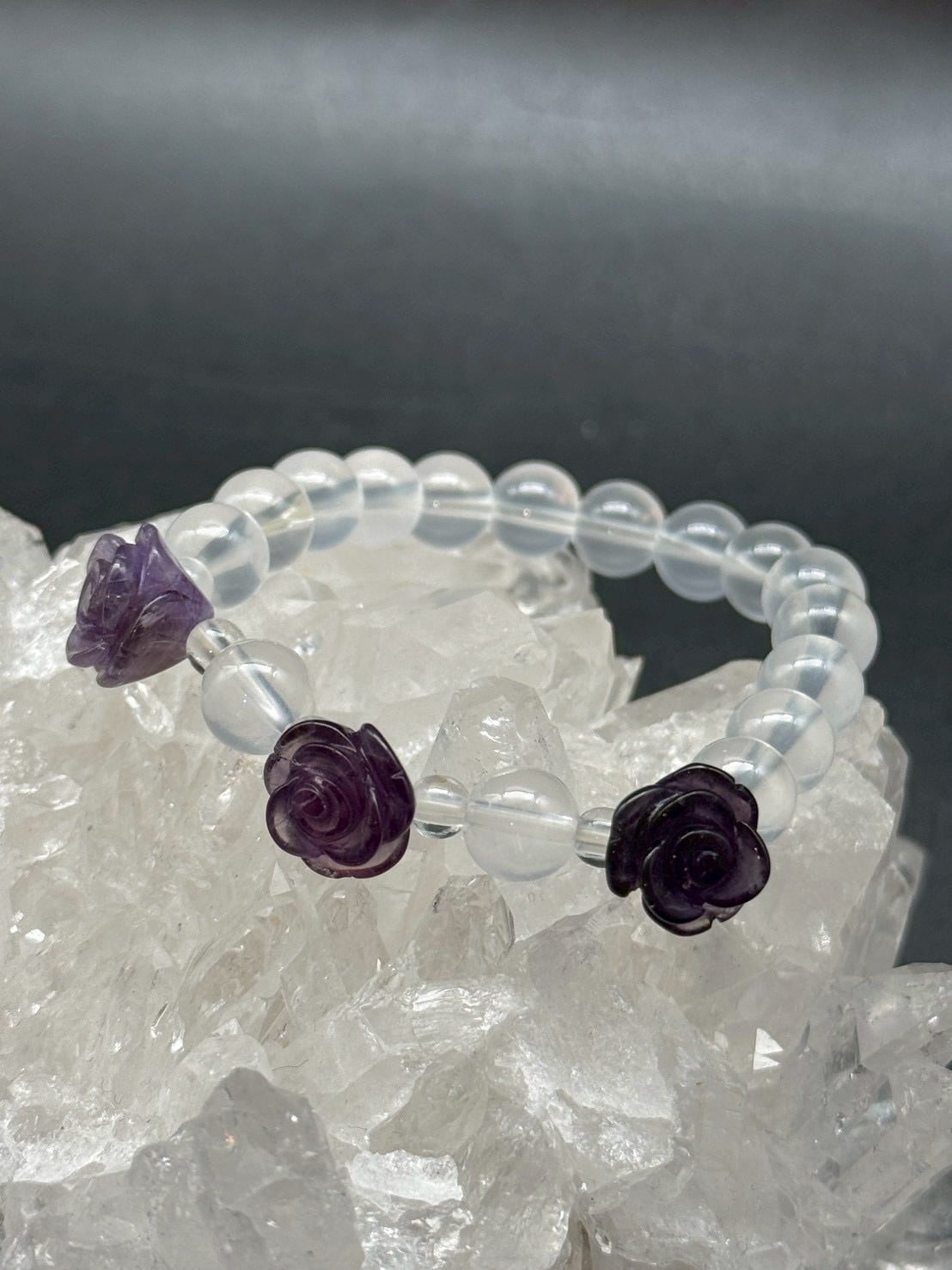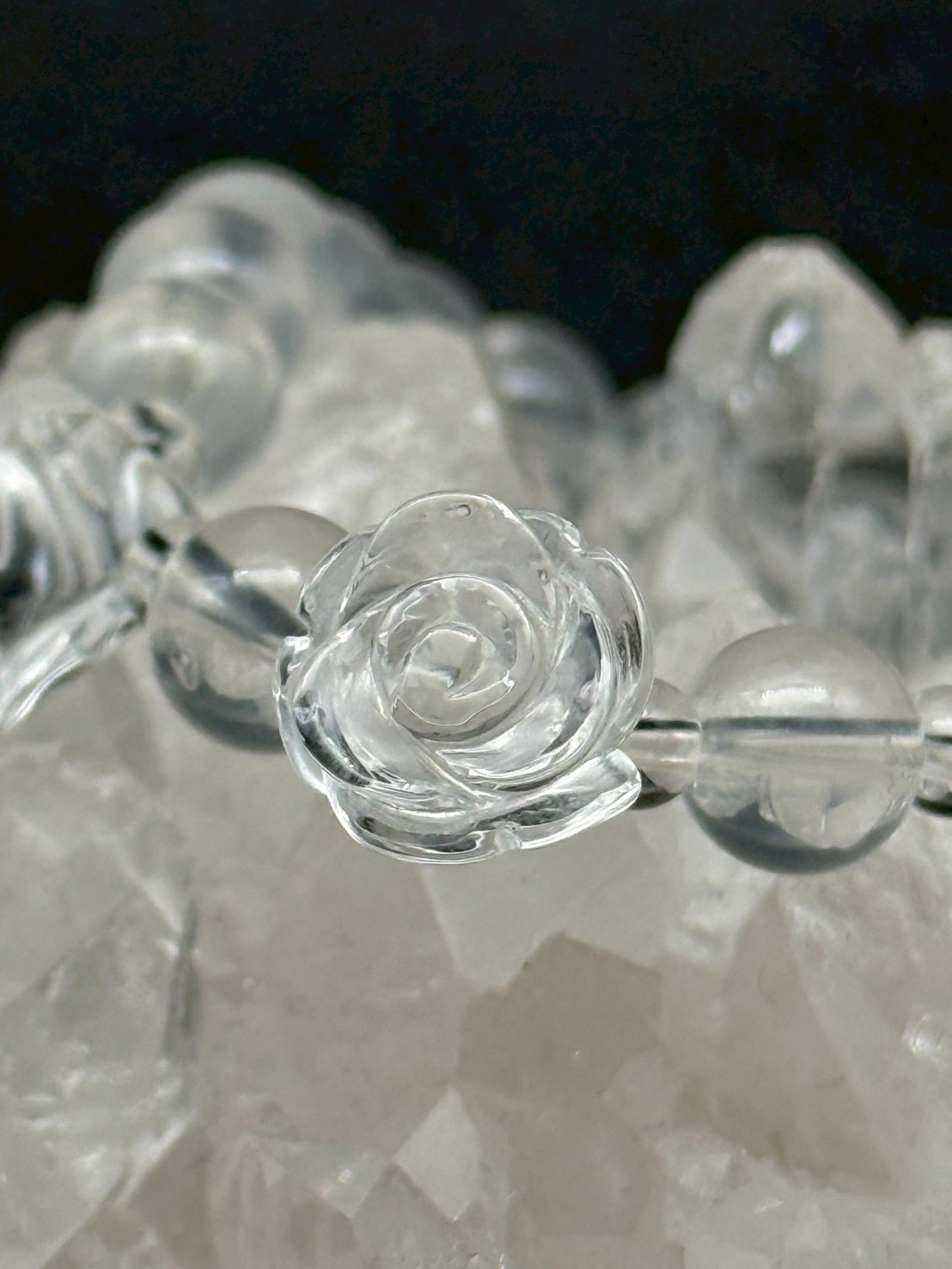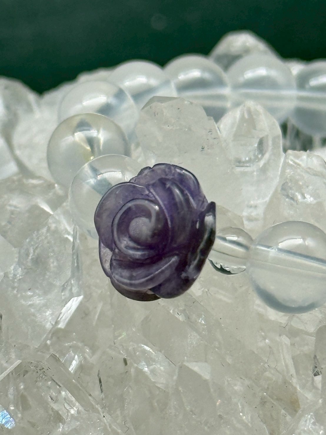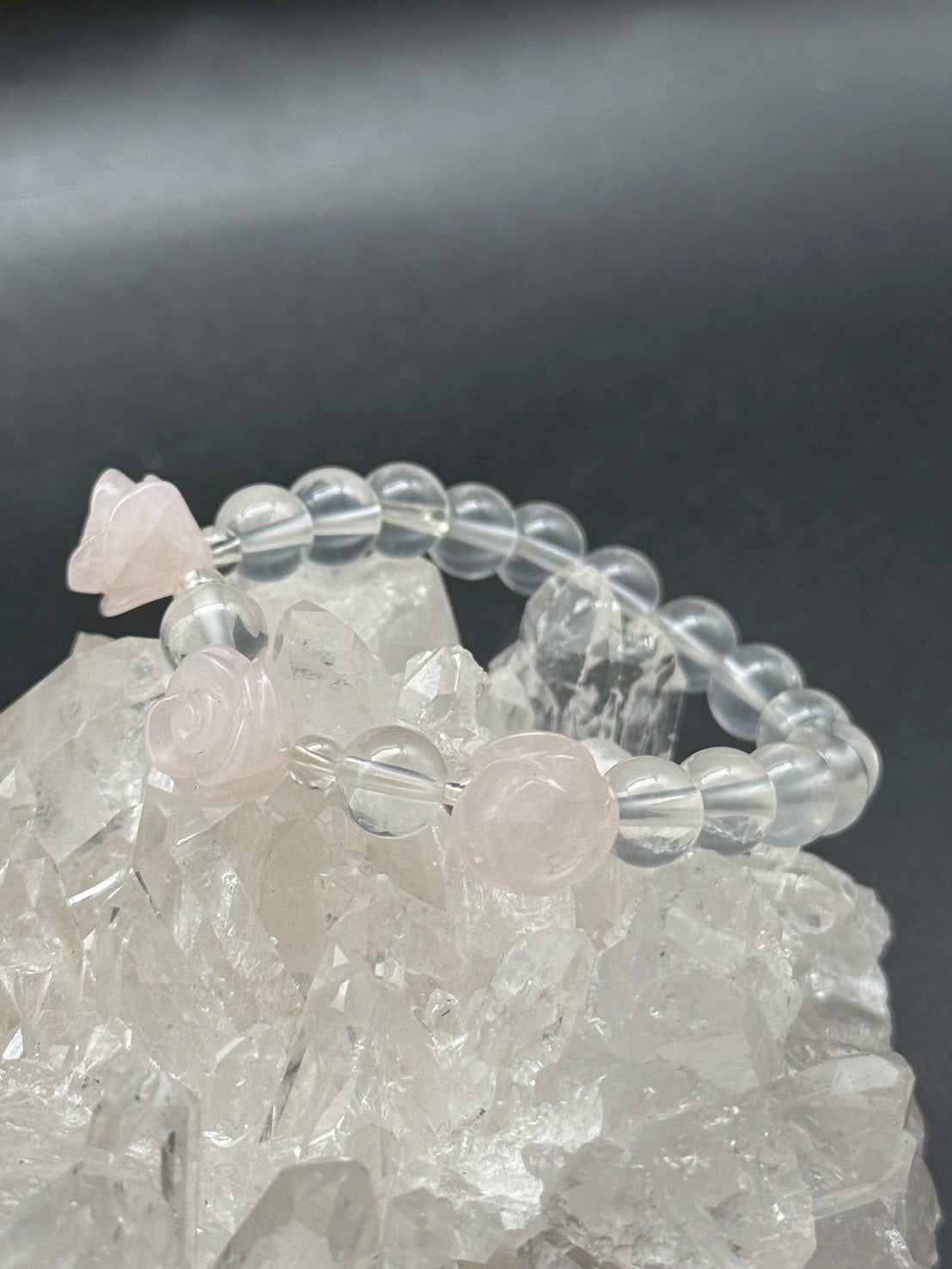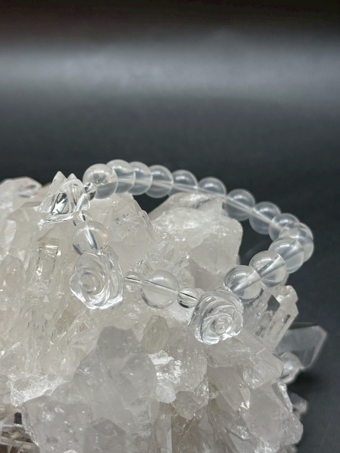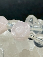 可愛らしい薔薇彫りの3粒と一緒に、優しい光を放ち癒しと浄化をもたらす、ミルキークォーツのブレスレットです!