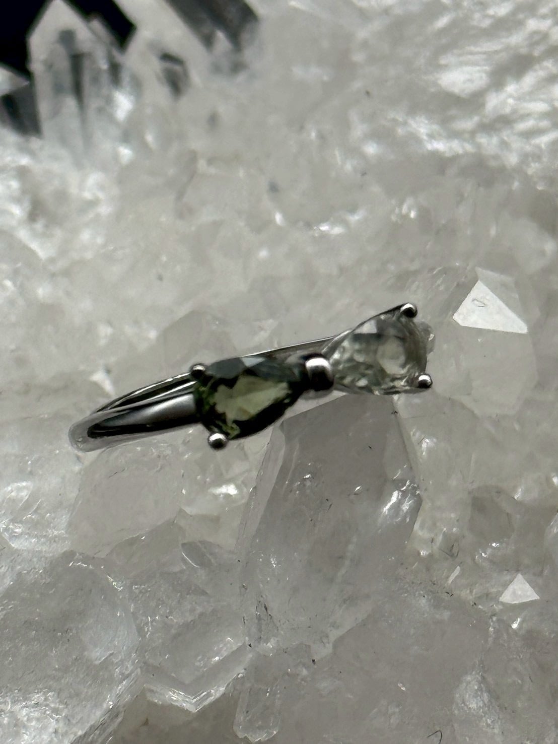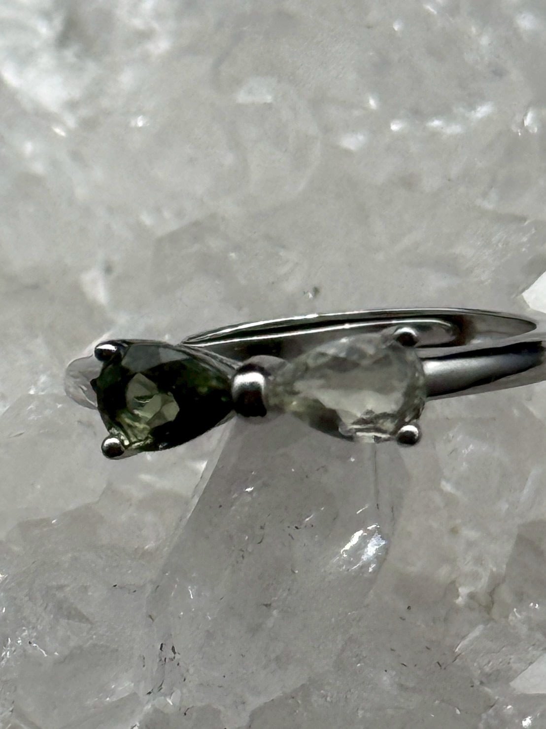 近年、非常に希少となった「モルダバイト」と「リビアングラス」のリボン型の、優しく輝きながら未来への道を導く、フリーサイズのリング(指輪)です!