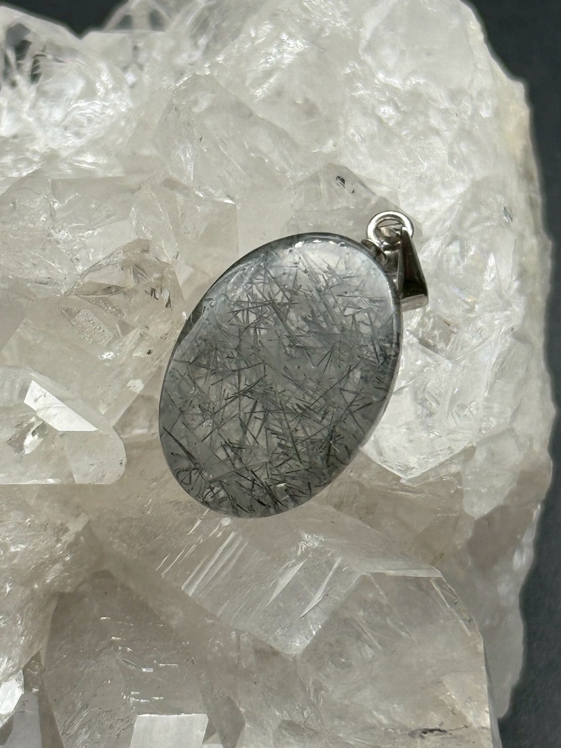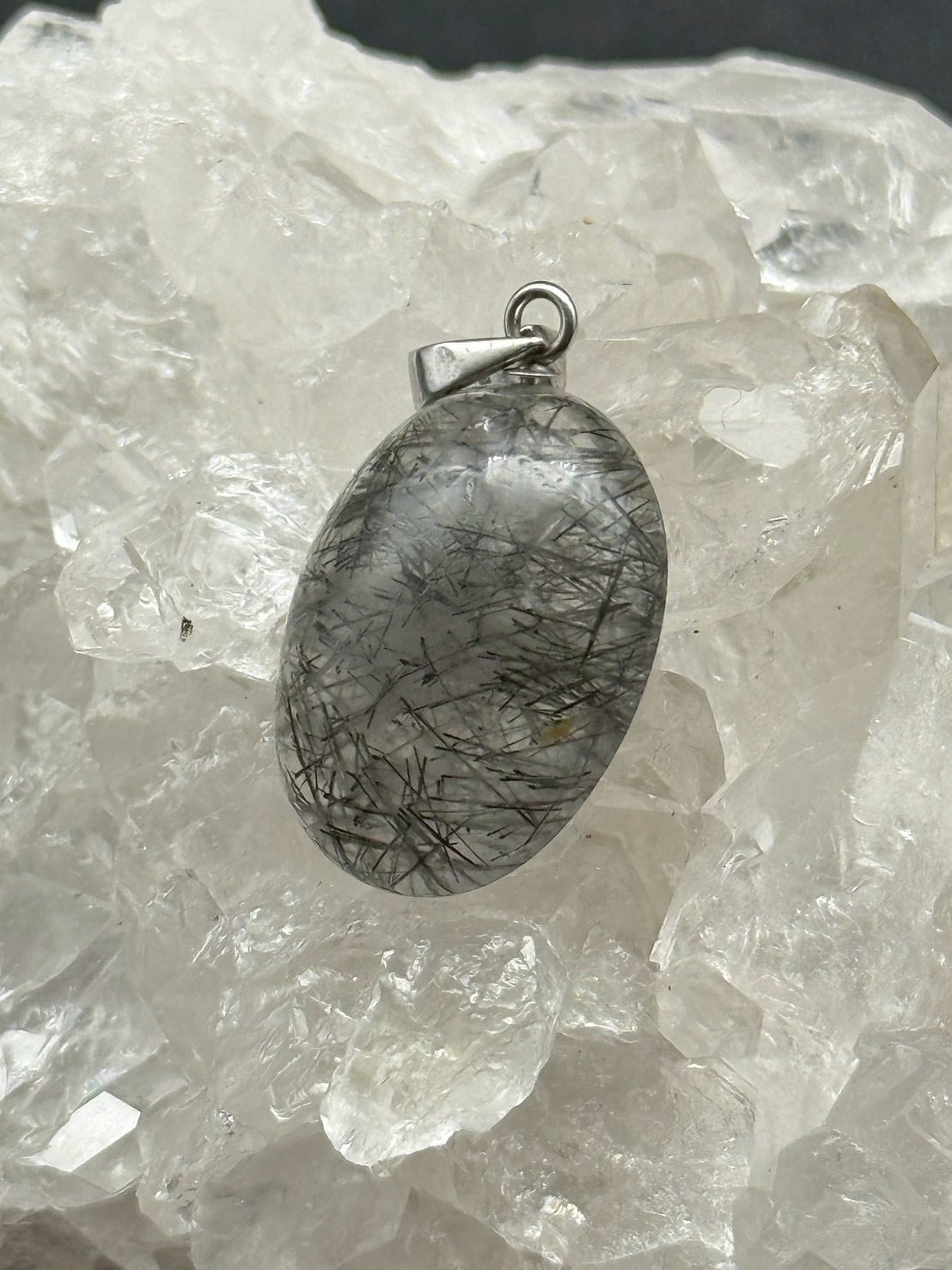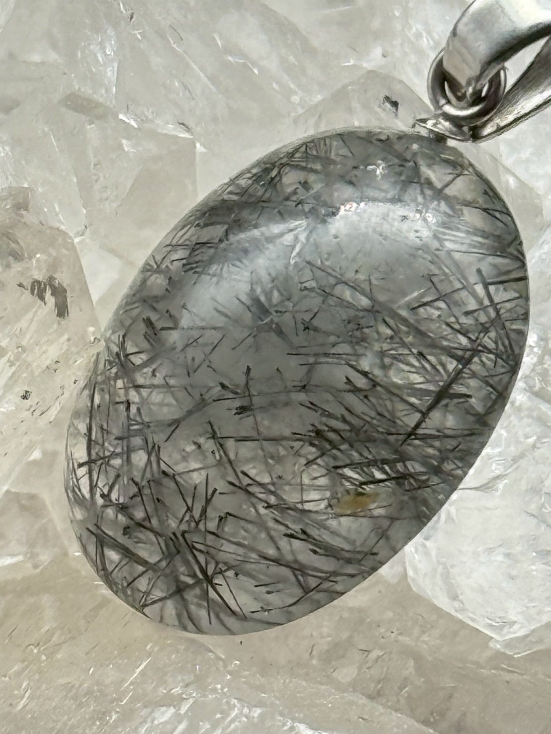 一点ものの美しい透明度の水晶にブラックトルマリンのルチル(線状鉱物)が内包された、「トルマリン・イン・クォーツ」のペンダントトップです!