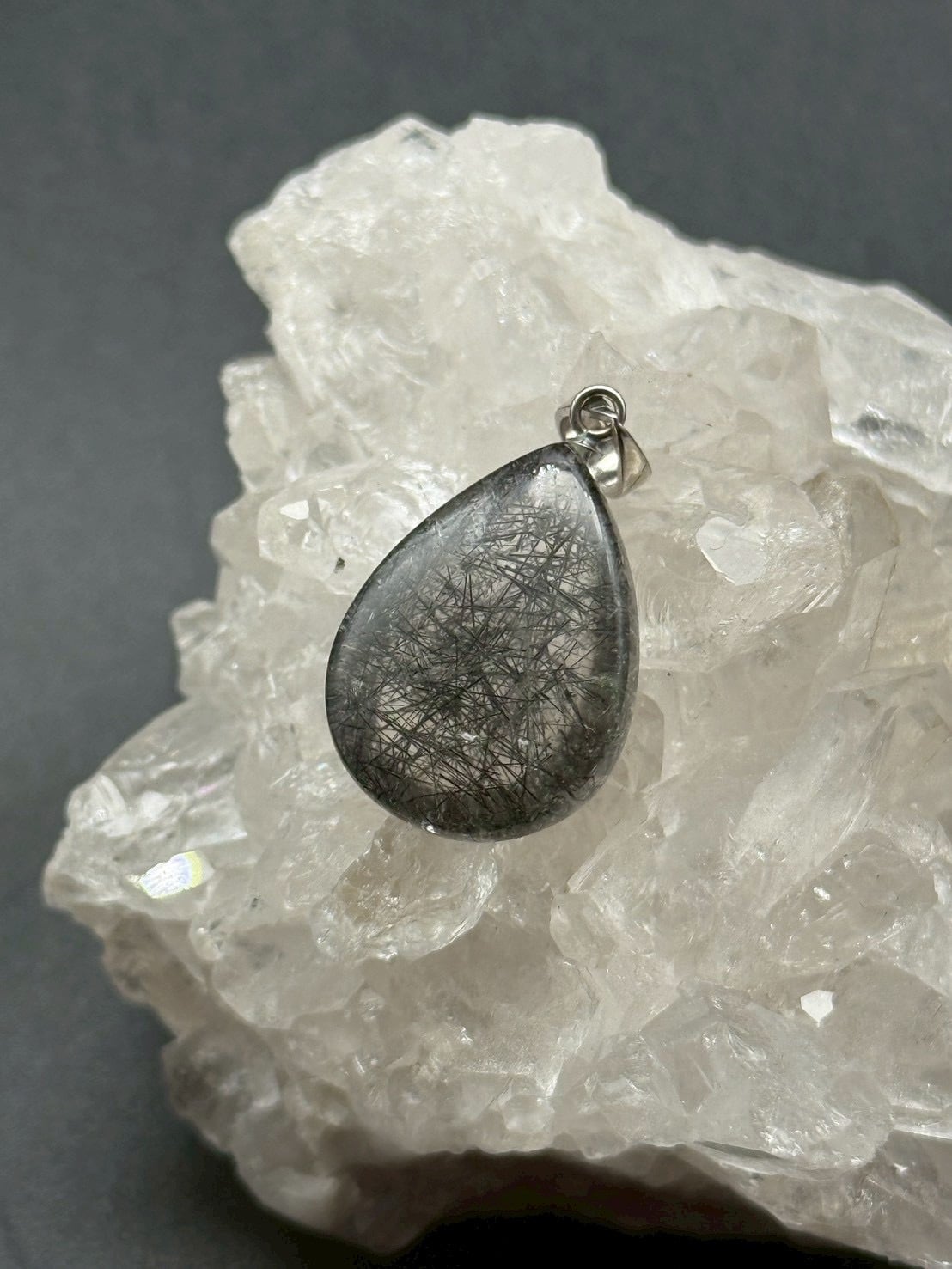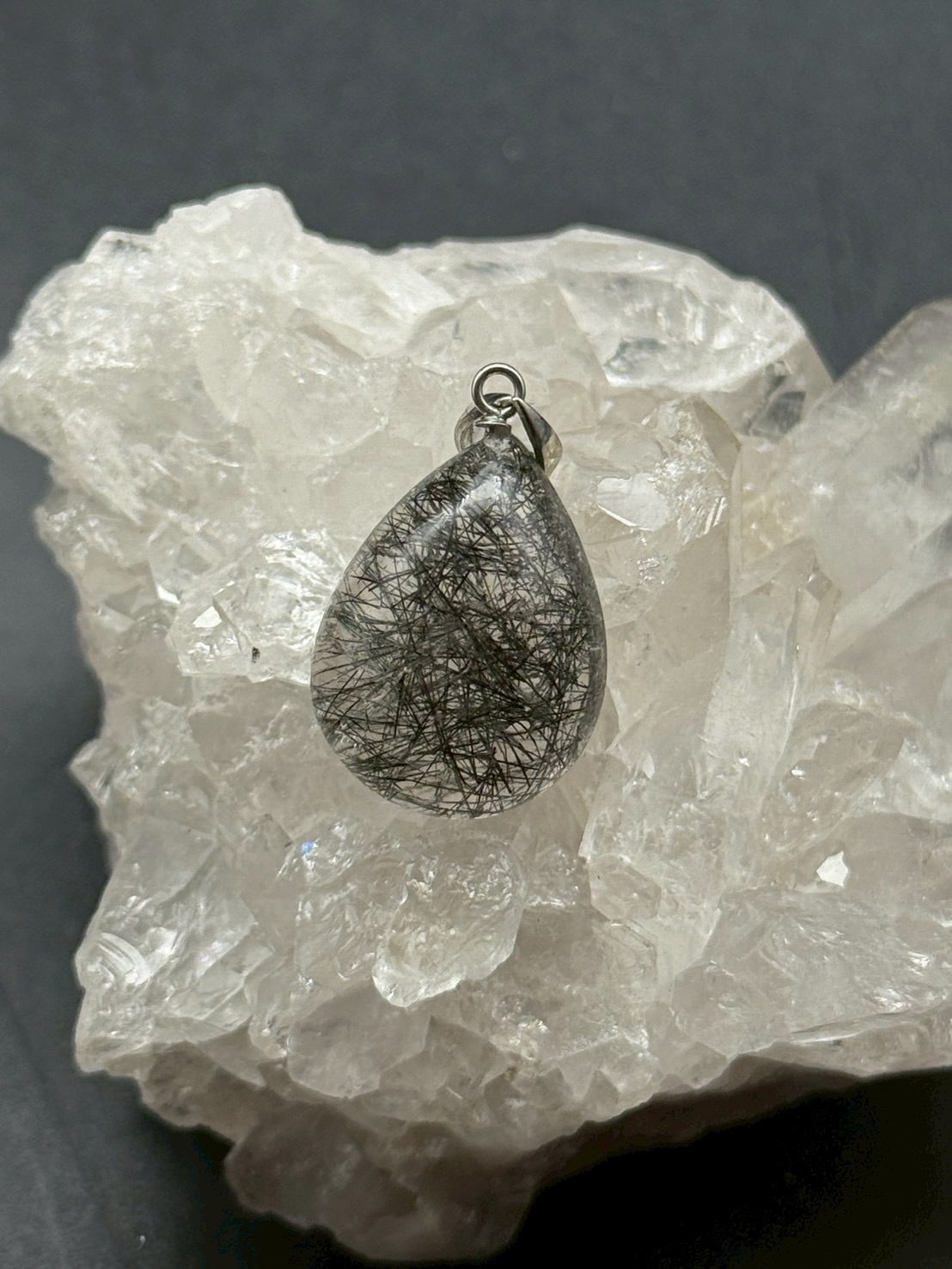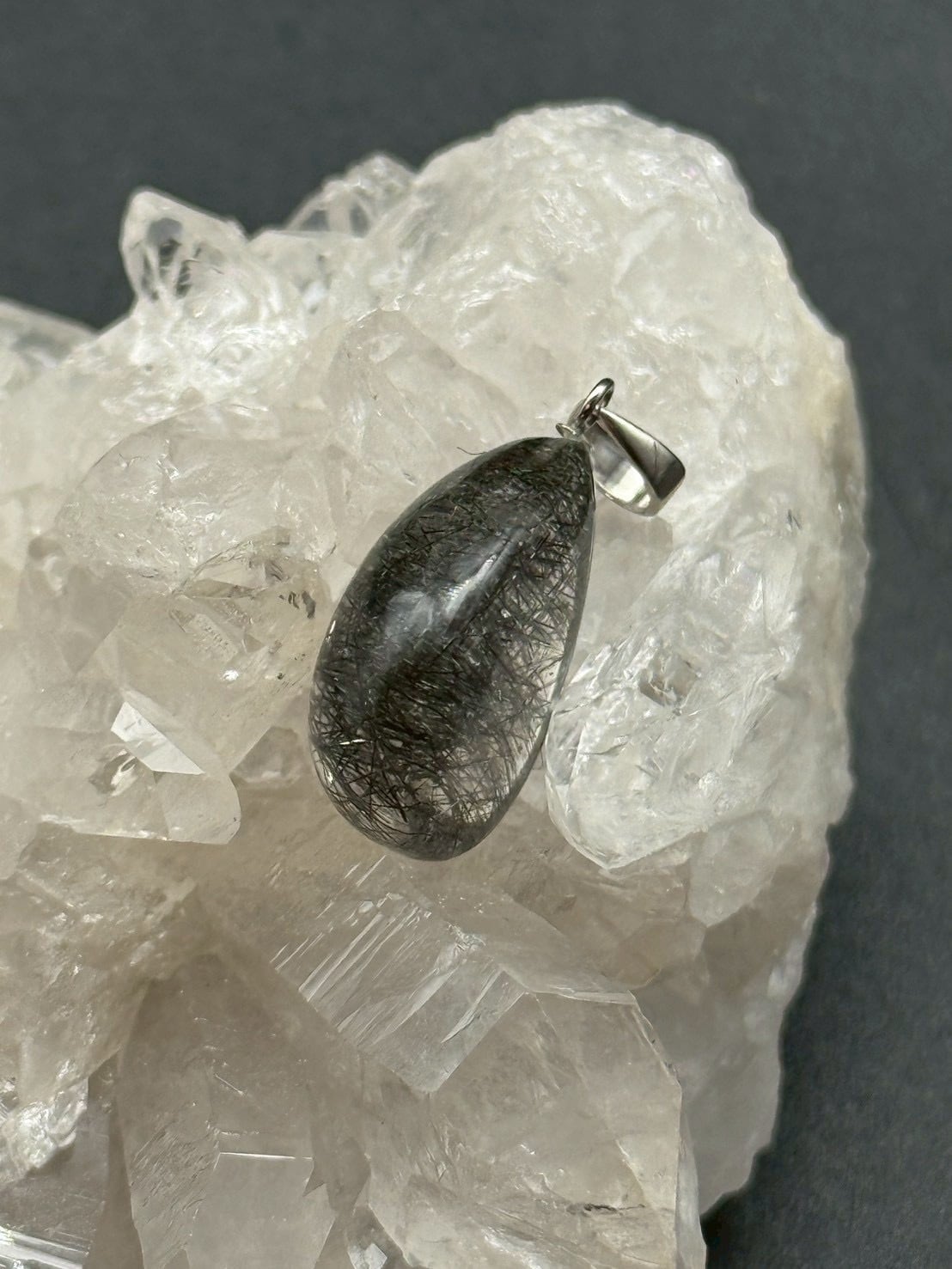 一点ものの美しい透明度の水晶にブラックトルマリンのルチル(線状鉱物)が内包された「トルマリン・イン・クォーツ」のペンダントトップです!