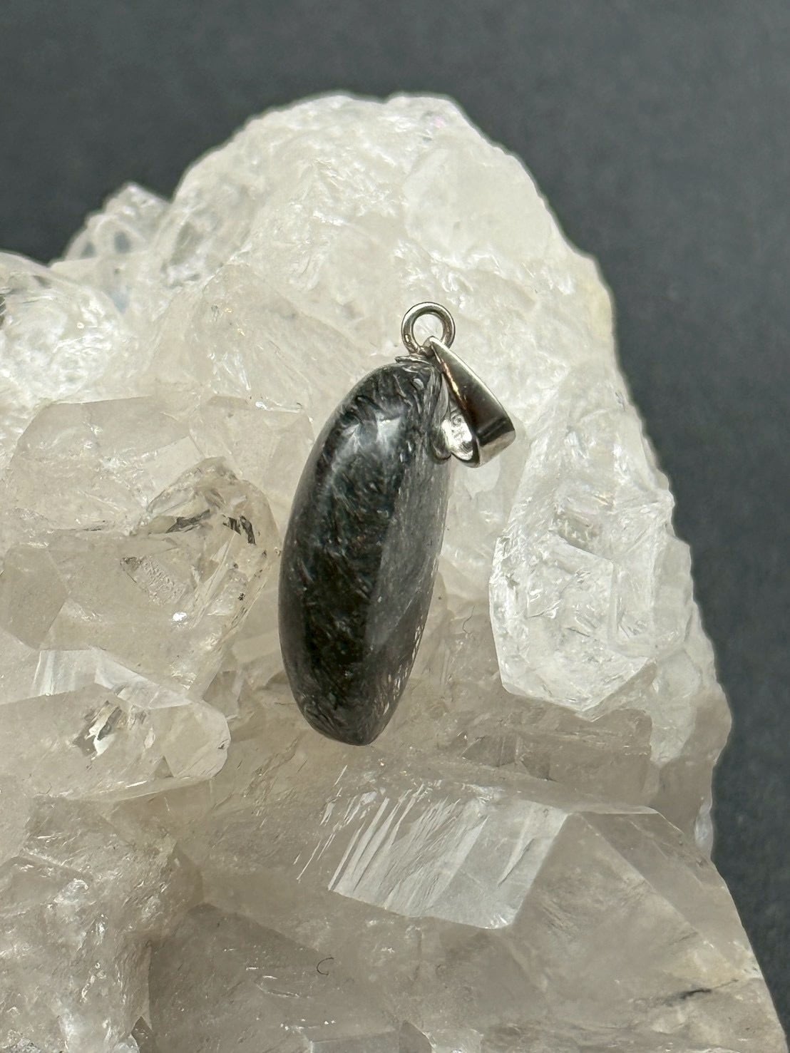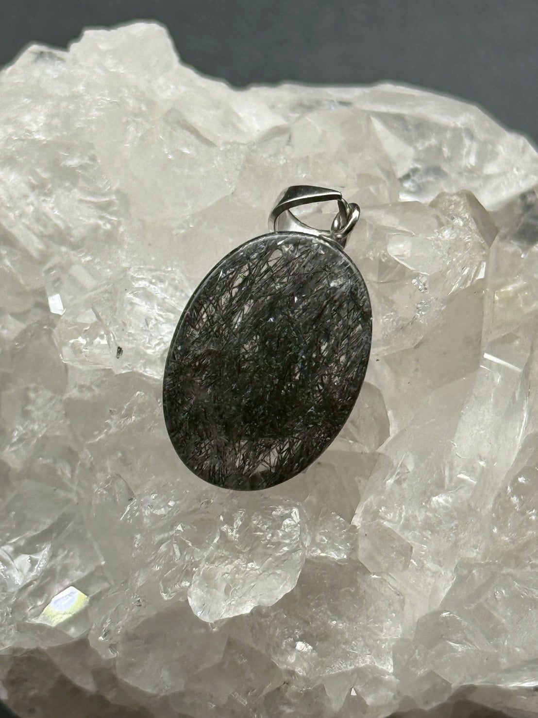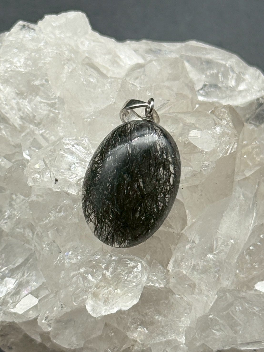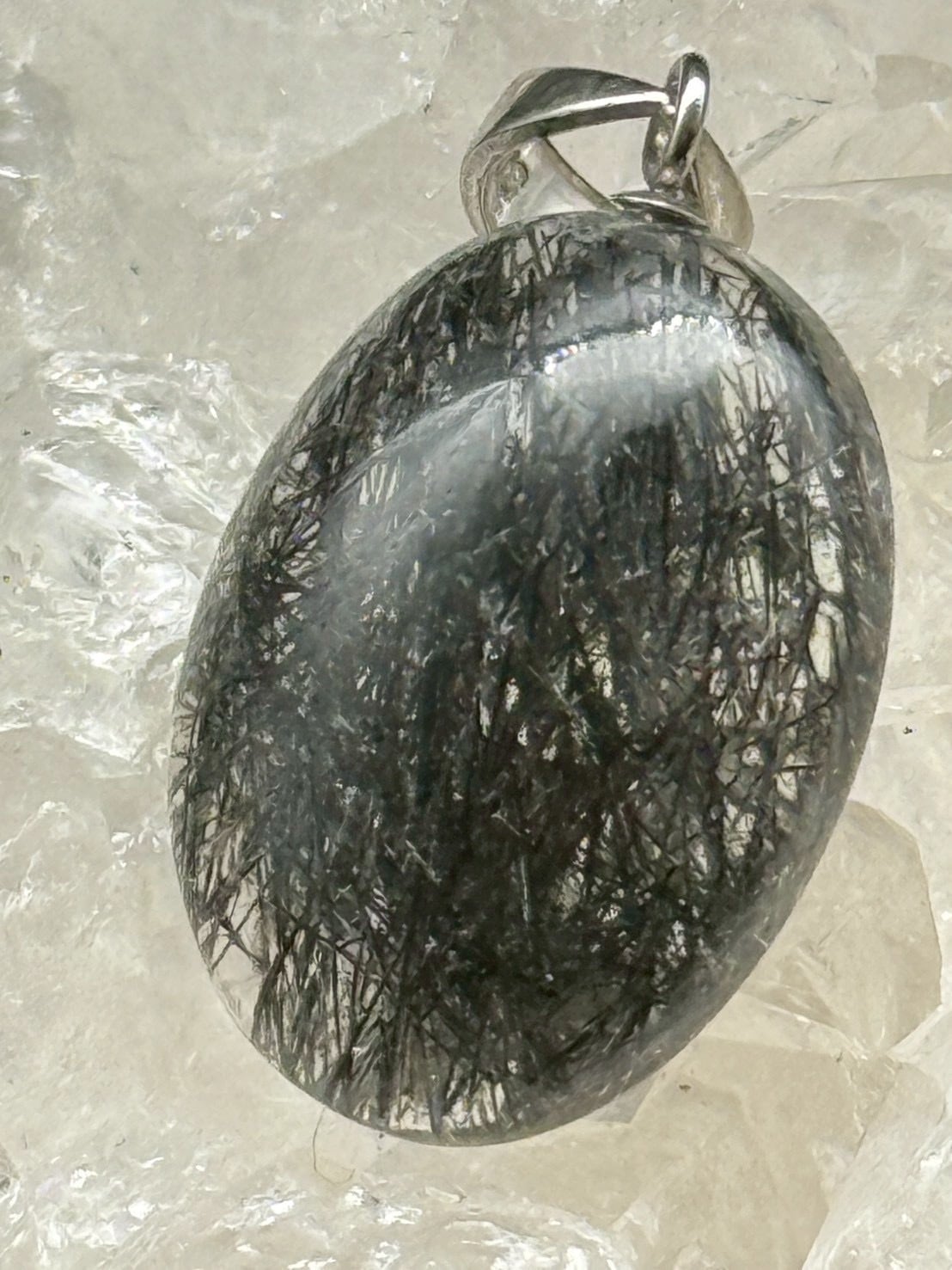 一点ものの美しい透明度の水晶にブラックトルマリンのルチル(線状鉱物)が内包された、「トルマリン・イン・クォーツ」のペンダントトップです!