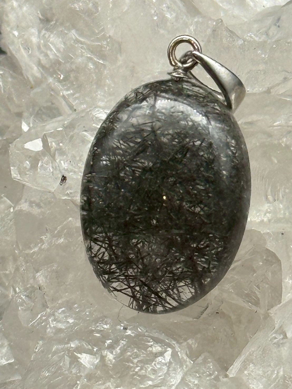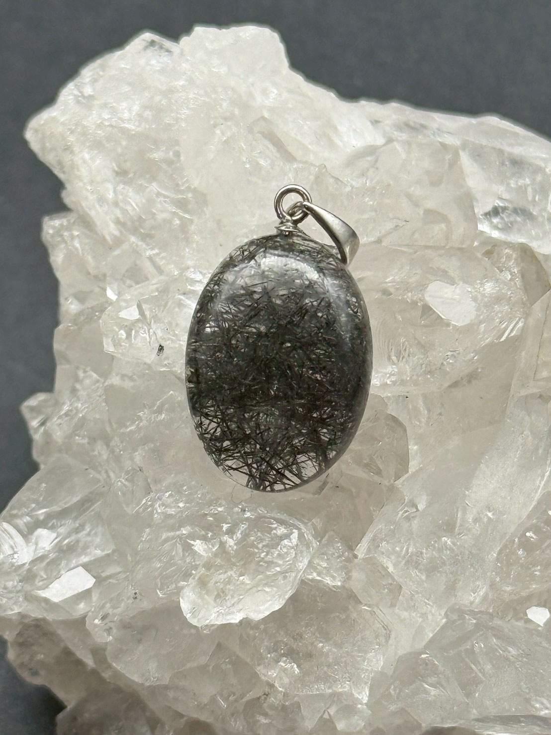 一点ものの美しい透明度の水晶にブラックトルマリンのルチル(線状鉱物)が内包された、「トルマリン・イン・クォーツ」のペンダントトップです!