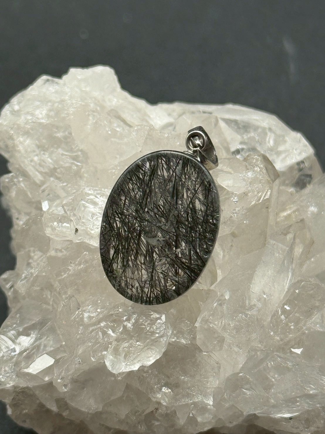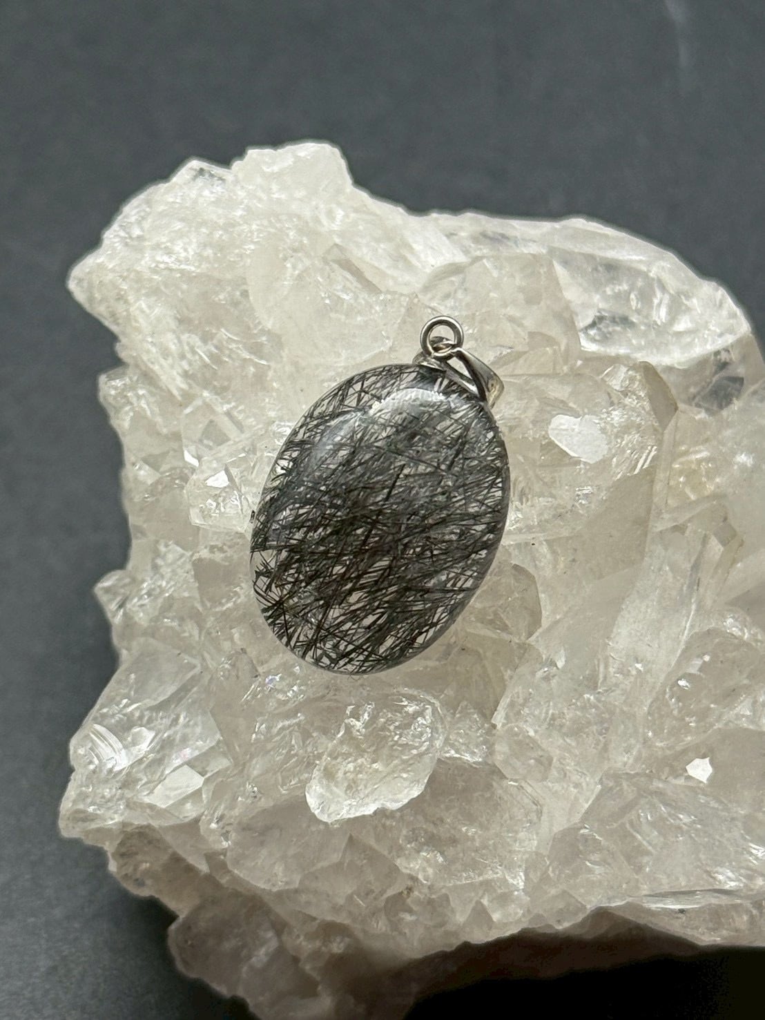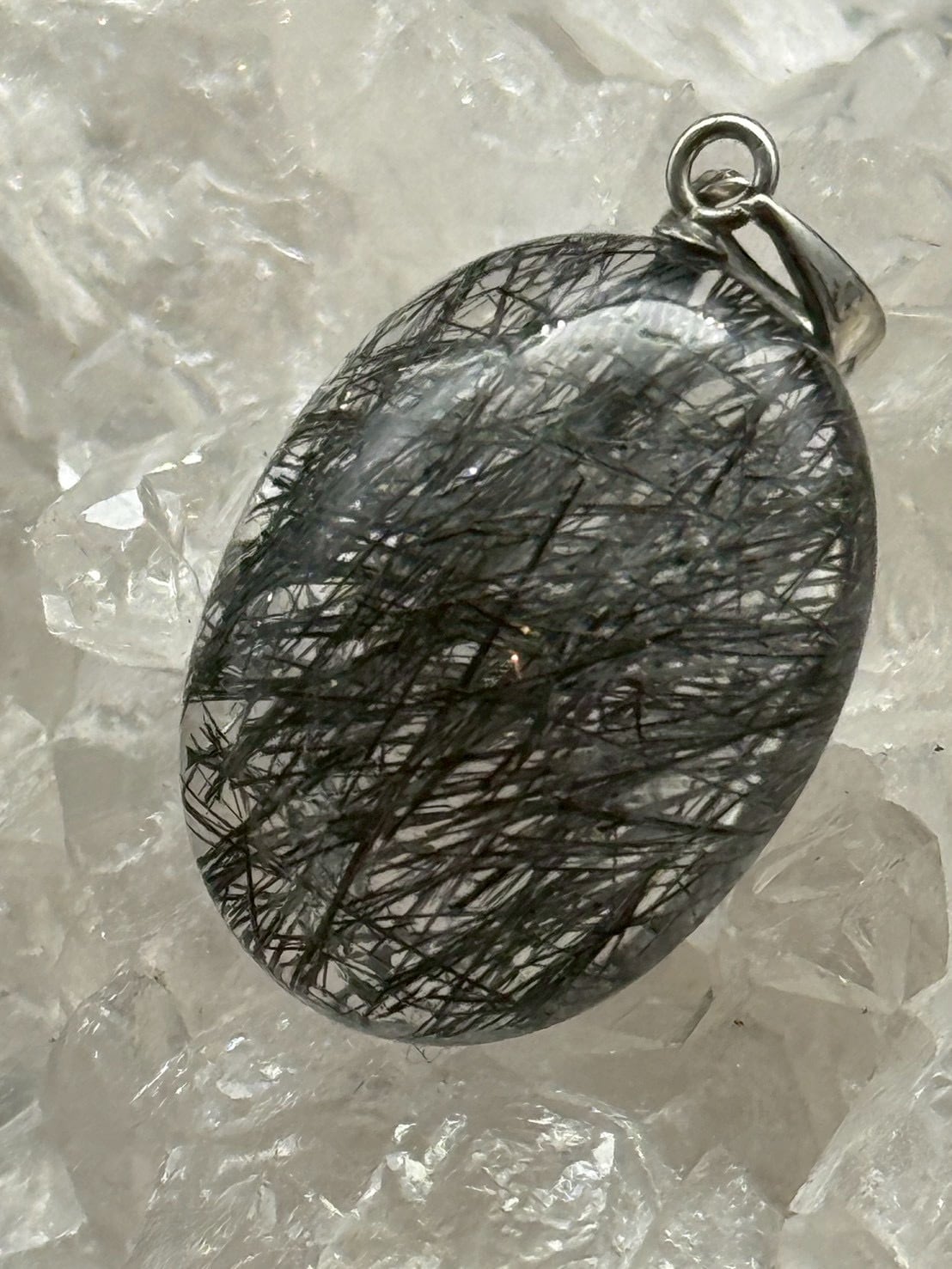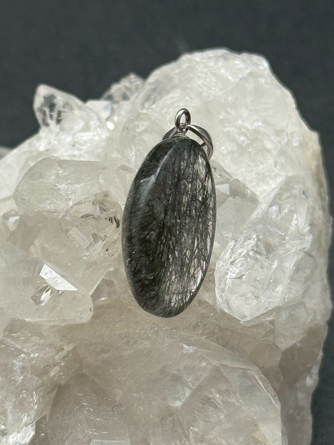一点ものの美しい透明度の水晶にブラックトルマリンのルチル(線状鉱物)が内包された、「トルマリン・イン・クォーツ」のペンダントトップです!