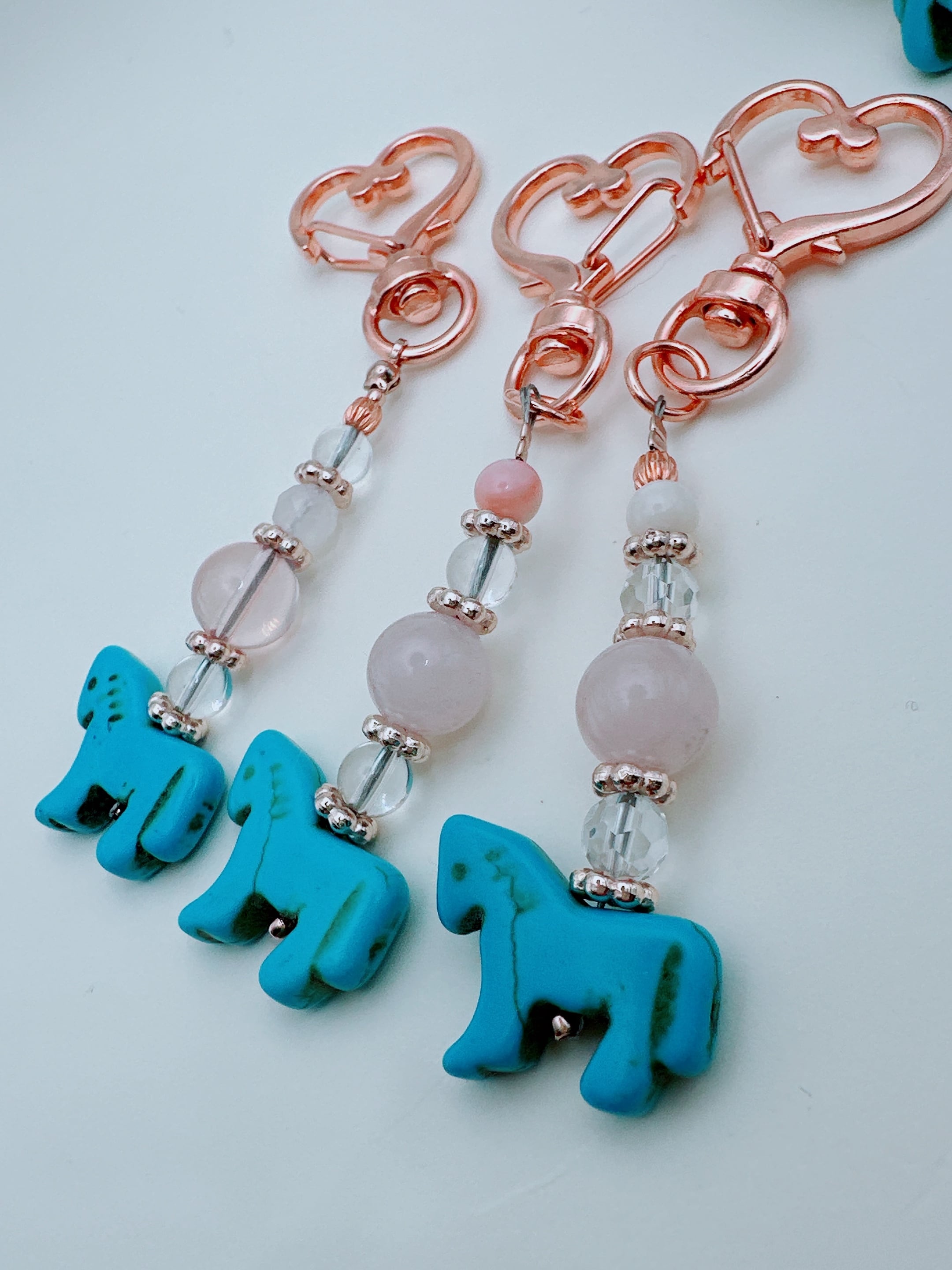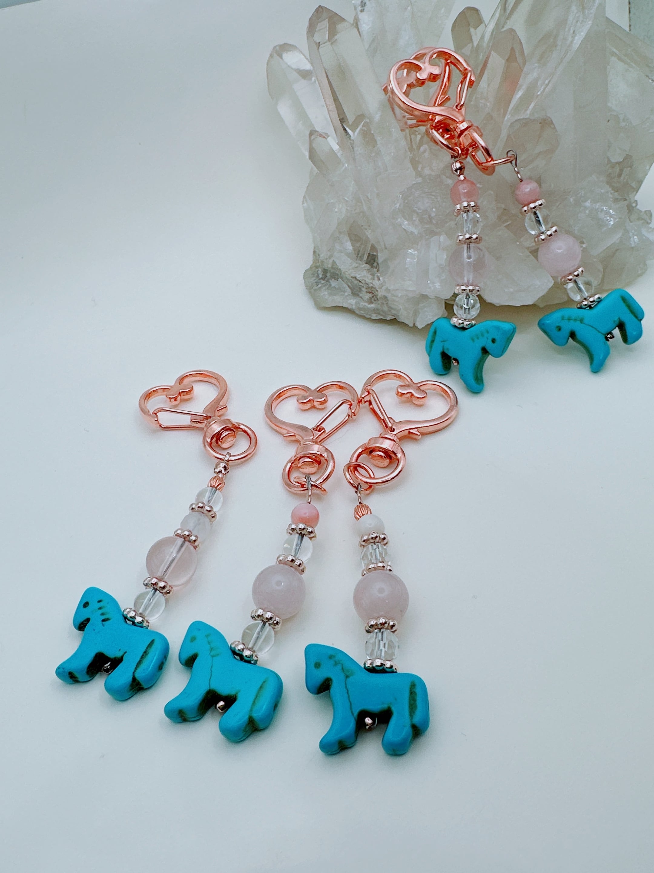 Krehaオリジナル・キーホルダーチャームは、2026年のラッキーカラーのひとつである「ターコイズ」色のハウライトターコイズの馬型がかわいらしい、ピンク色のローズクォーツと水晶、ピンクオパールを用いた、シンプルだけれど心強いお守りとして、願いを叶える強い味方となるチャームです。