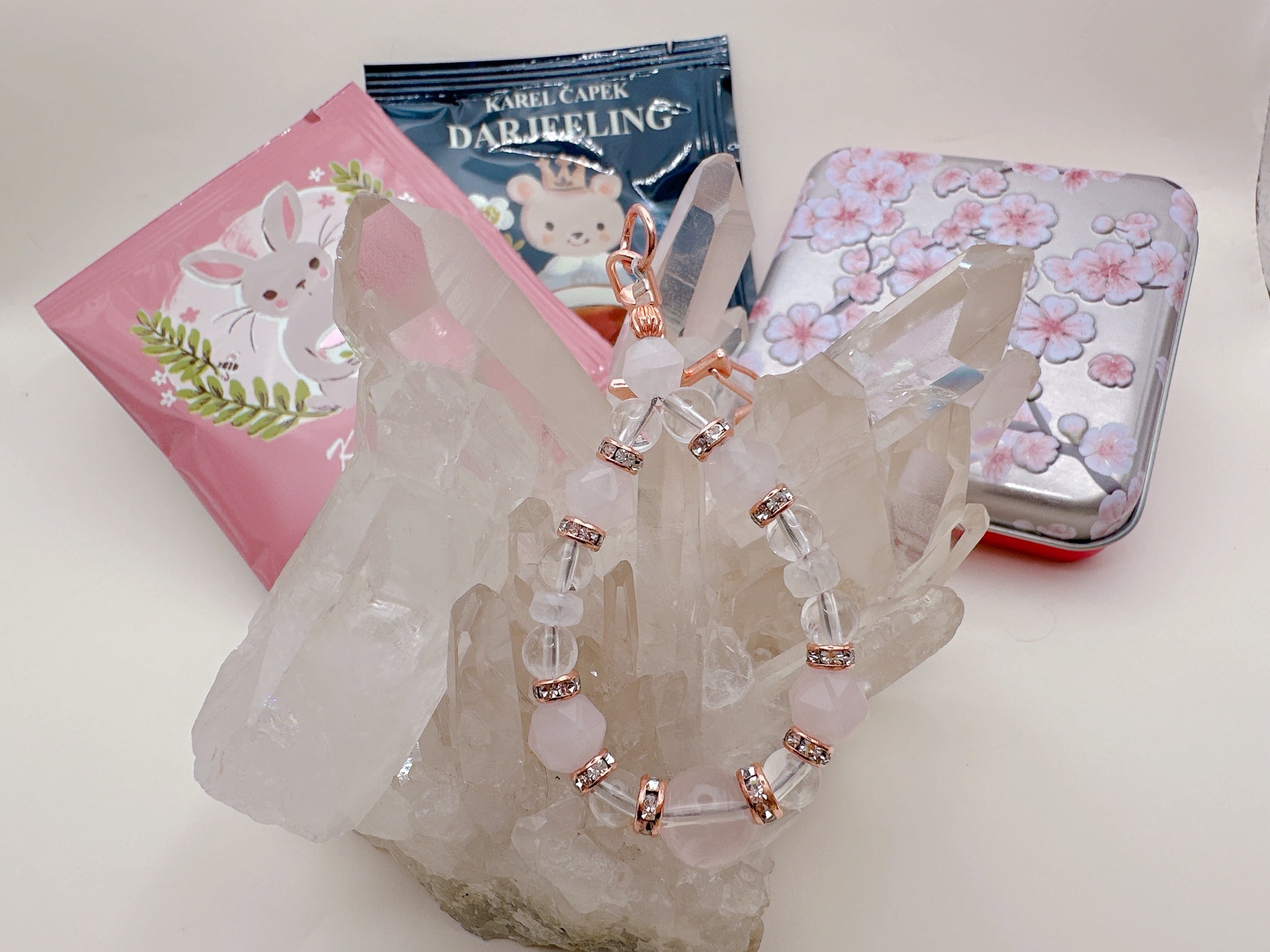 ピンク色のローズクォーツやピンクオパール:持ち主の心身の輝きと愛情の光に共鳴し、現実の生活において、心と身体のバランスを守り、愛情豊かに生きる強い光で包み、里多き人生へとサポートします。