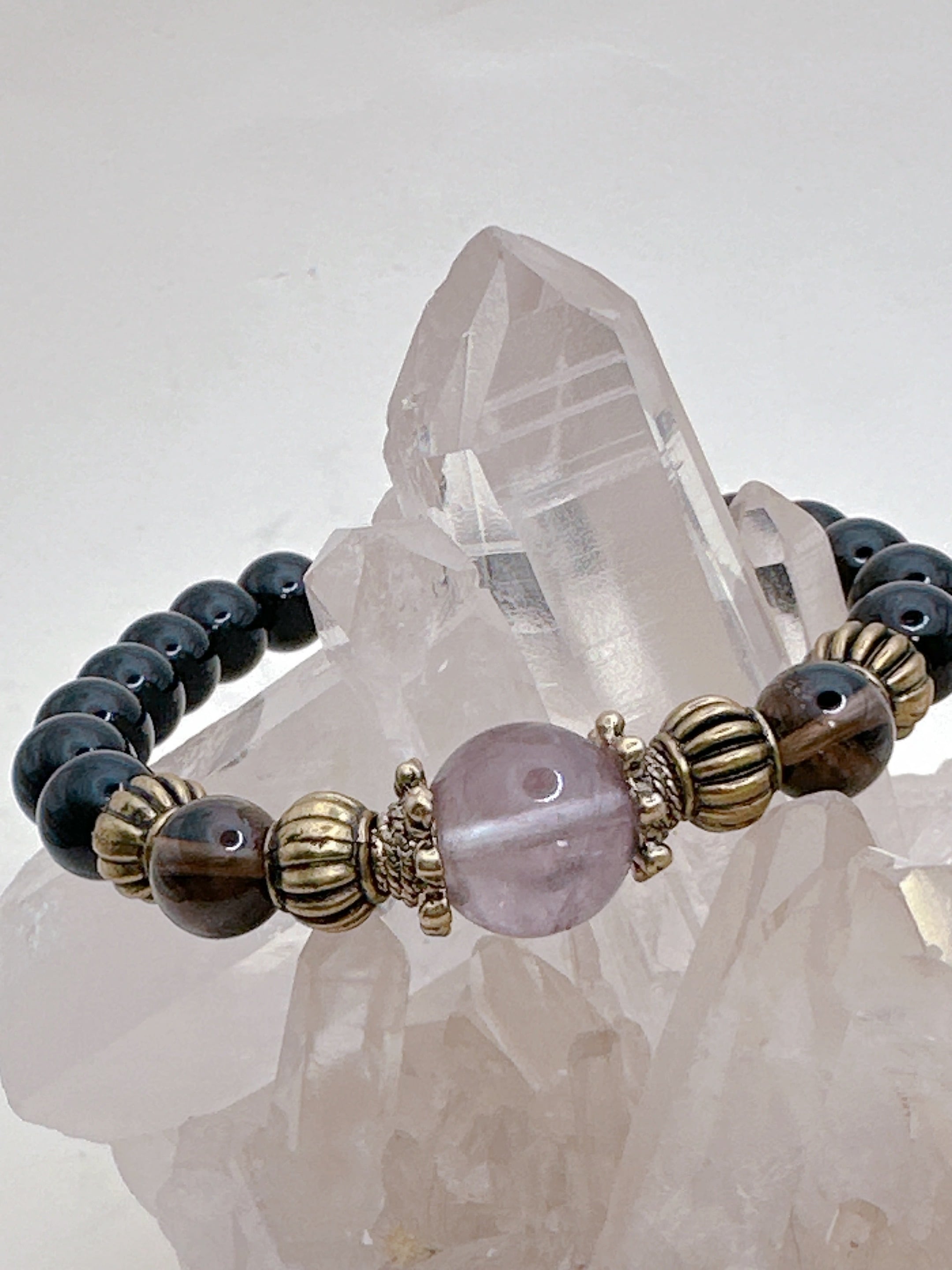 ポイントのレインボー水晶やスモーキークォーツと共に、輝く光を見失わせないように、