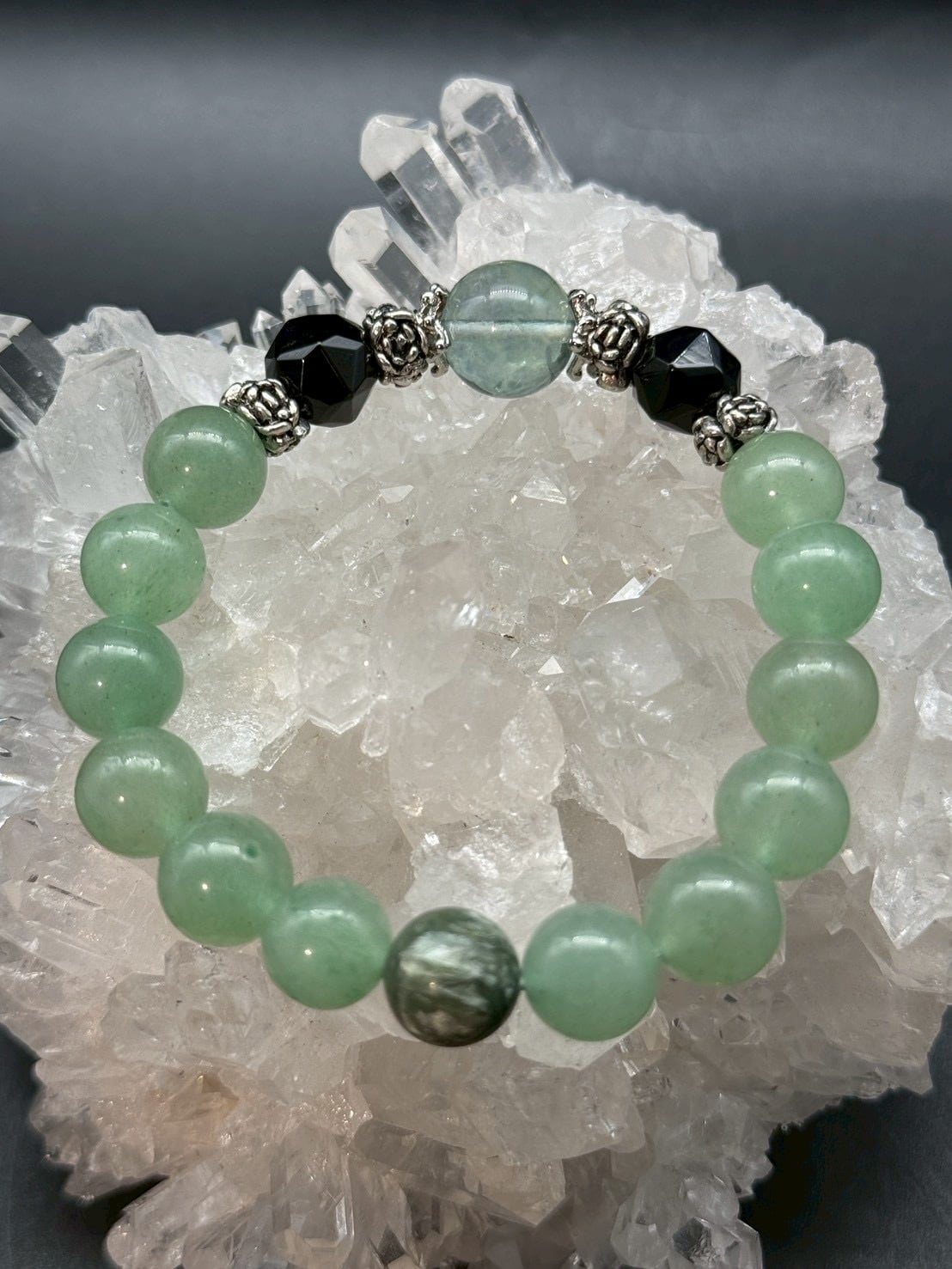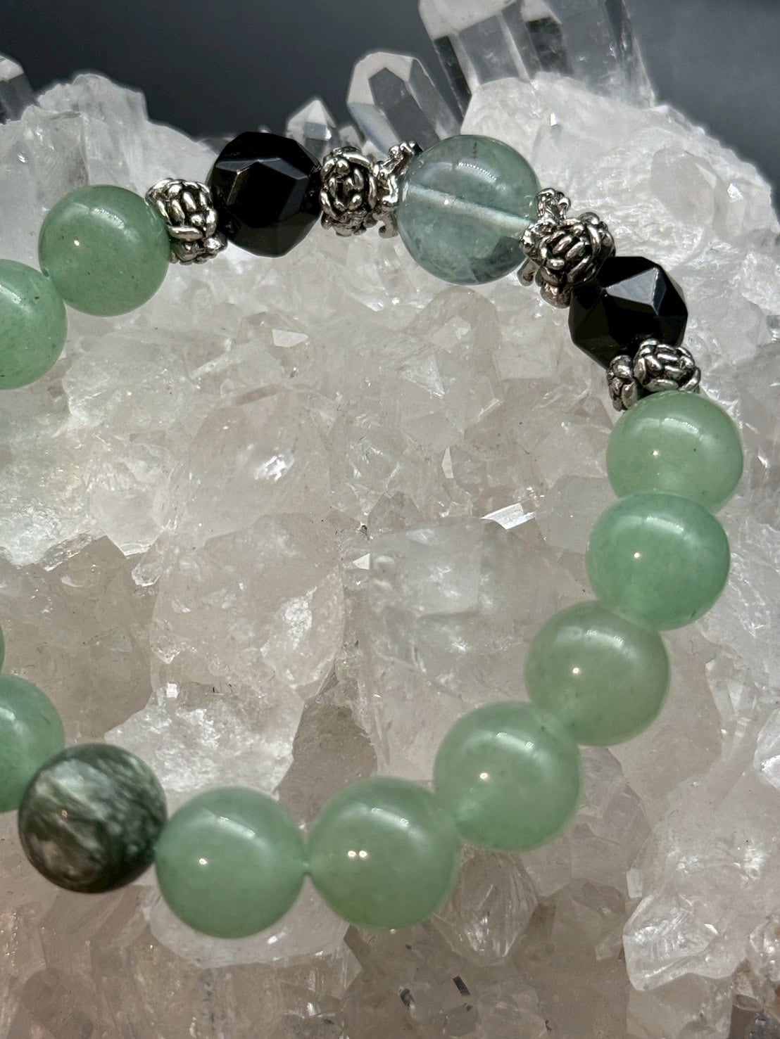 こちらのブレスレットには、その中でも、非常に癒しと浄化力の高いグリーン系を主に使用しています。