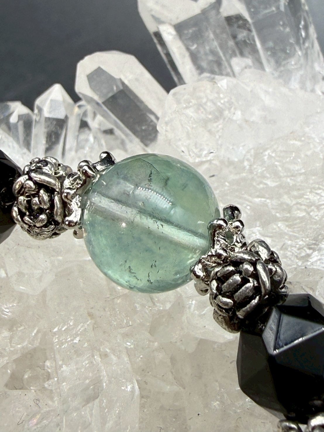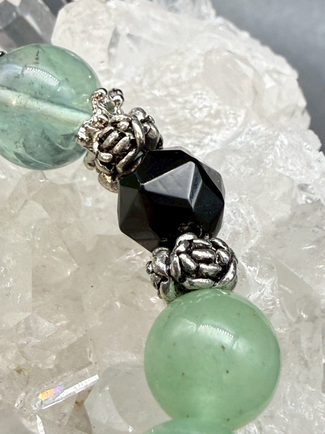 ポイントの大粒のグリーンフローライトが、そっと優しくも強い光の保護をし、心身の煌めきが現代に生きる強い輝きを呼び覚まします。