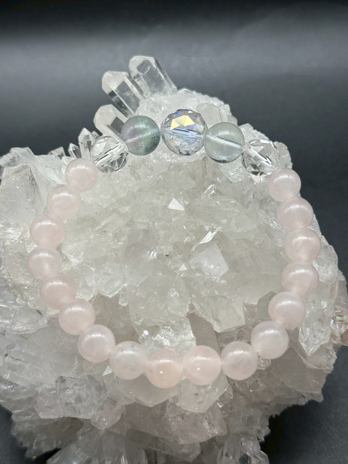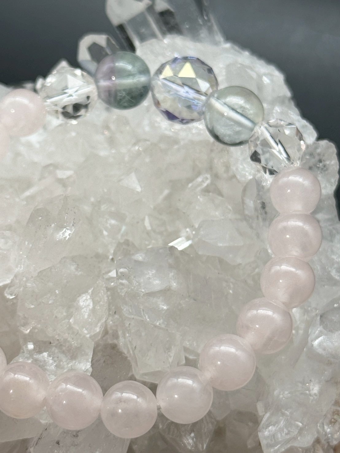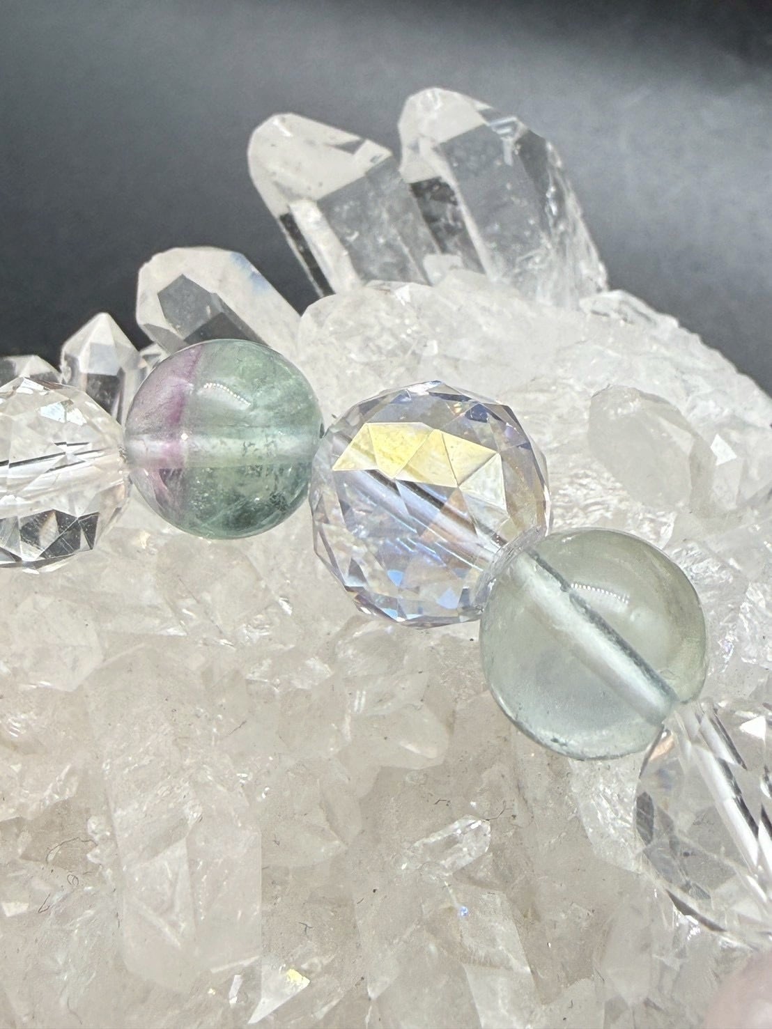 ポイントの大きめなオーロラクォーツの虹色の煌めきは、身に付ける方によりつく邪気や邪念から身を守り、心身の健常と健やかな毎日、そして本来の自分らしく生きる力と輝きを呼び覚まし、幸福な未来へと導きます。