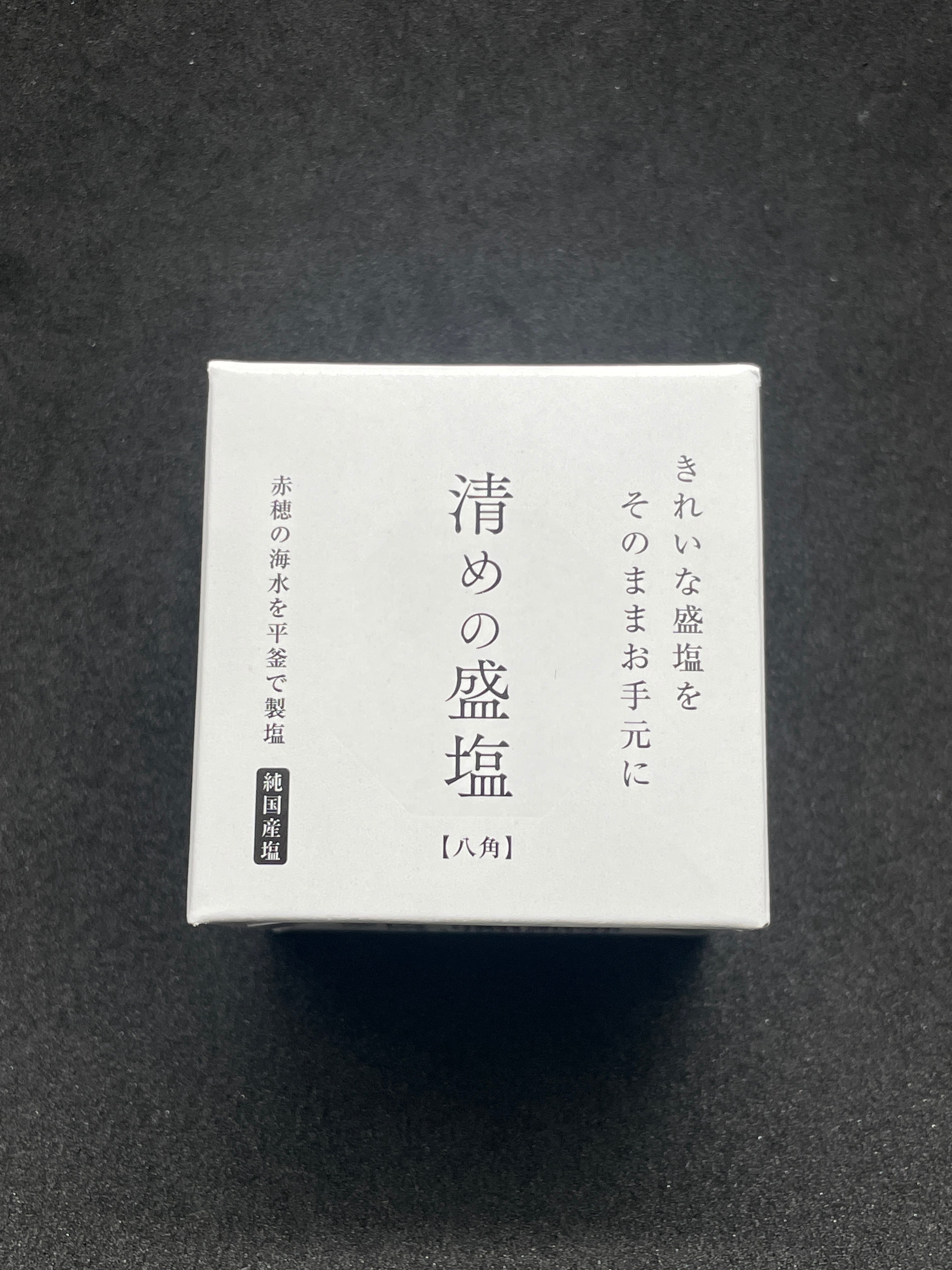 本製品のお塩は、赤穂の海水を汲みあげ、平釜で製塩した純国産のお塩です。しっとりとした質感と、真っ白で美しい結晶の「清めの盛塩」は、ひときわきれいな八角形の盛塩です。
