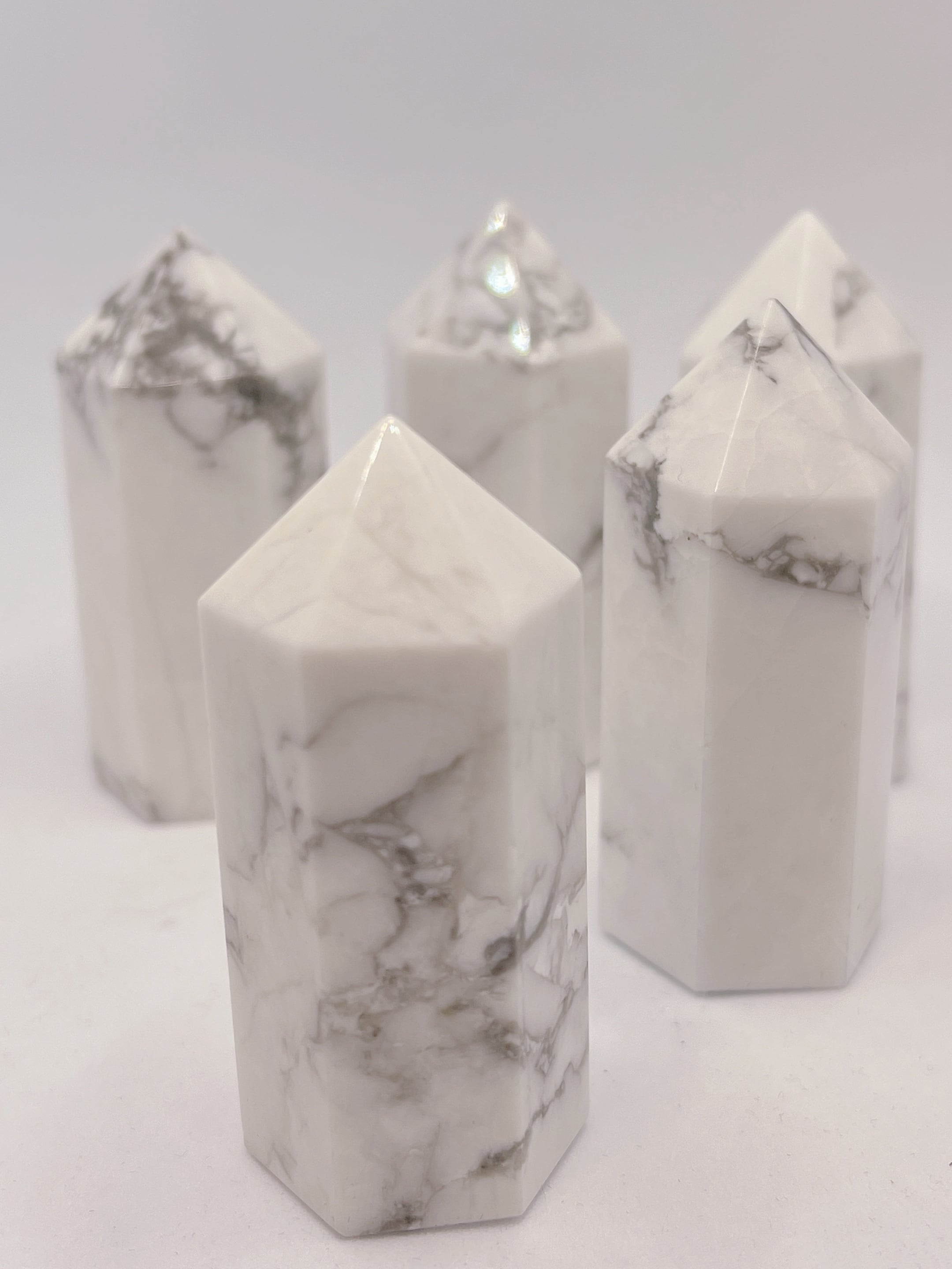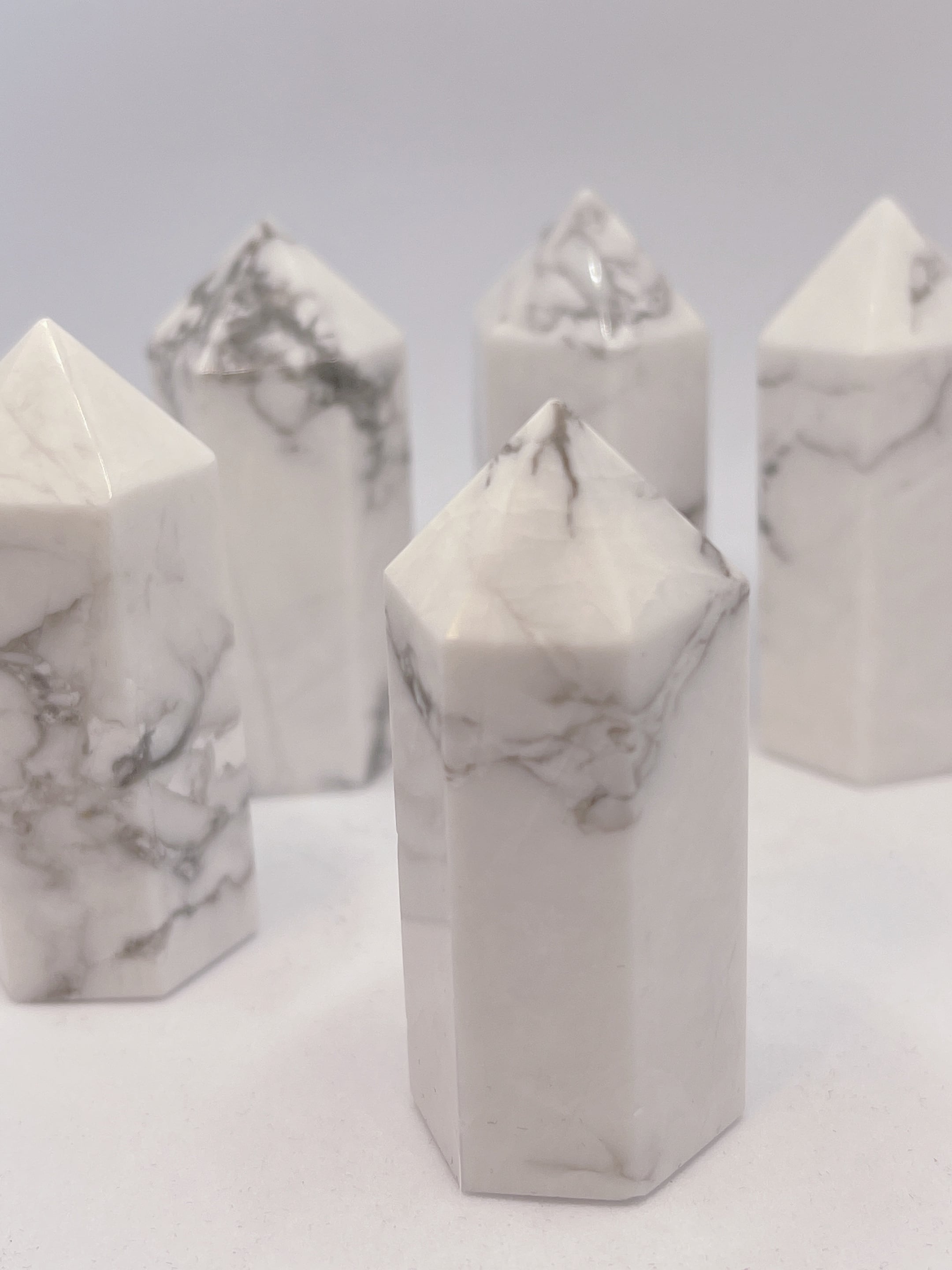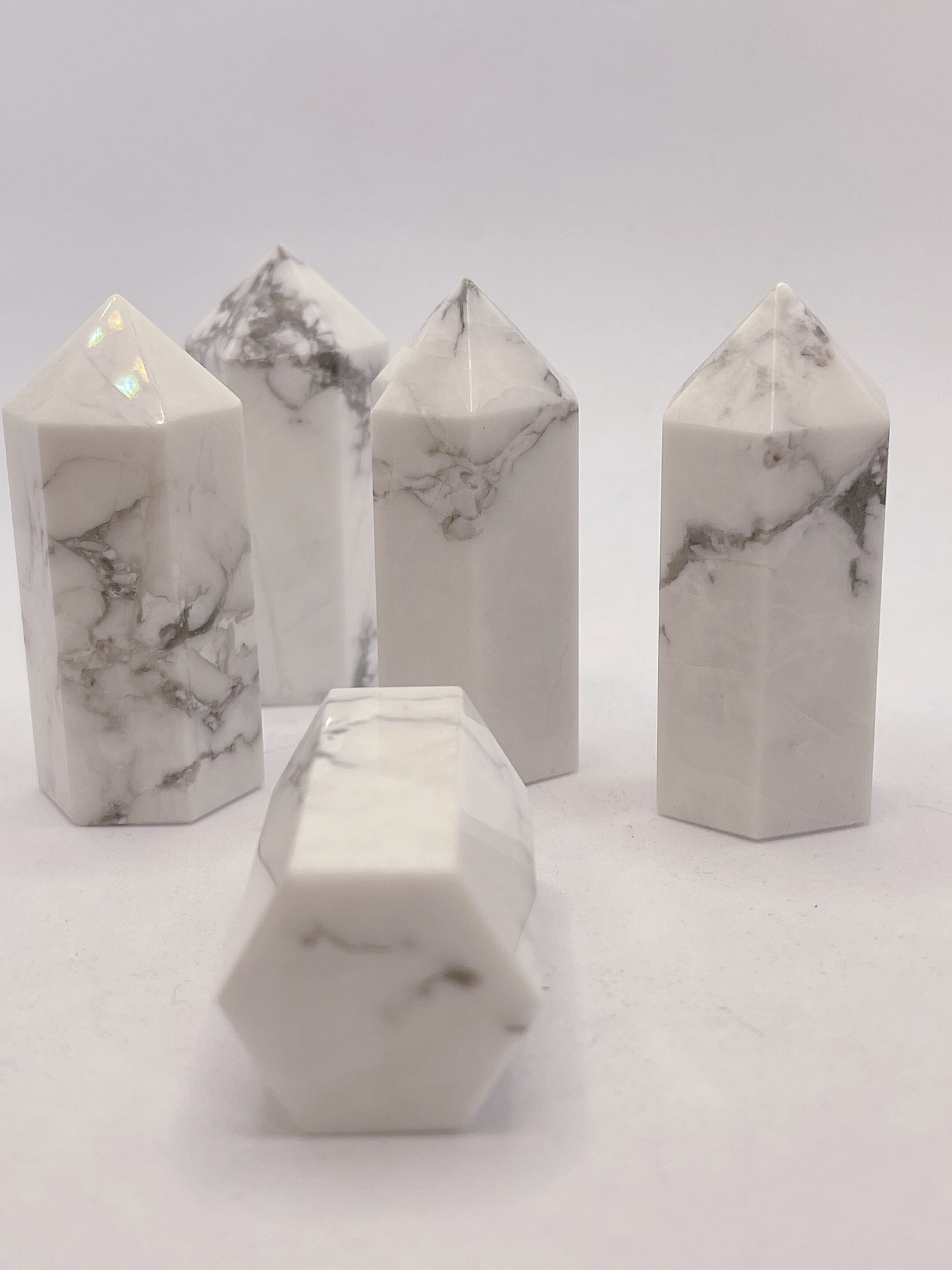 白く大理石のような模様を持つ【ハウライト(マグネサイト)】の六角柱です。