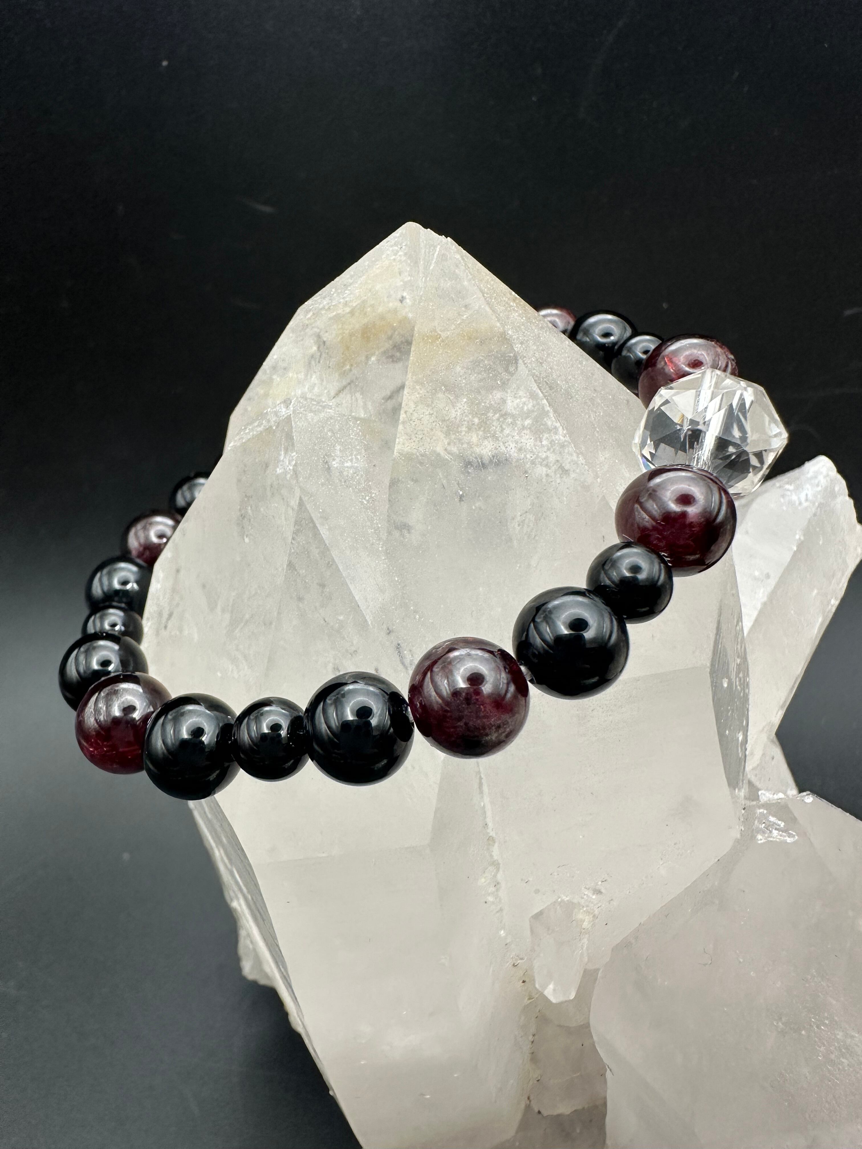 さらに、こちらの商品は、ガーネットのパワーをより共鳴し、浄化力を高めるべく、水晶のスターカット、オニキス、モリオン(黒水晶)をポイントに組み、身に付ける方の人生という歩みに力強い味方となる環として仕上げました。